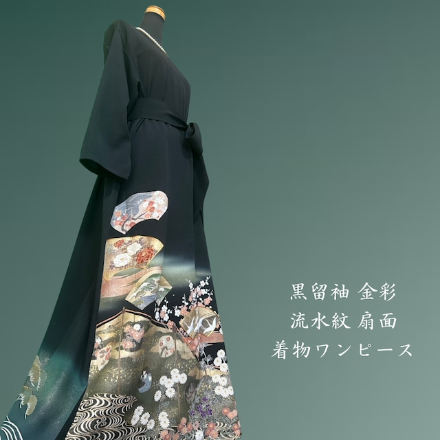 黒留袖 金彩 流水紋 扇面 着物ワンピース