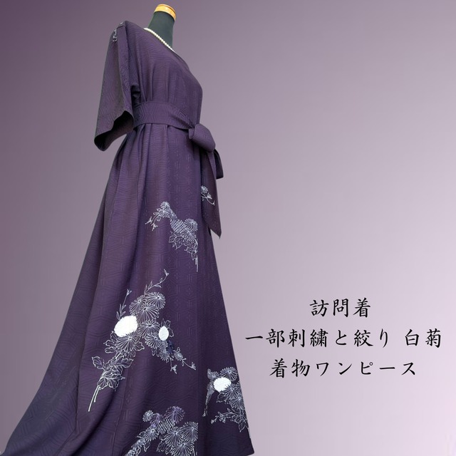 訪問着 一部刺繍と絞り 白菊 着物ワンピース