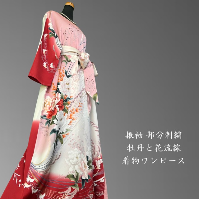 振袖 部分刺繍 牡丹と花流線 着物ワンピース