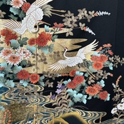 そのなかを羽ばたく鶴は、長寿や繁栄、夫婦円満を象徴する吉祥文様。