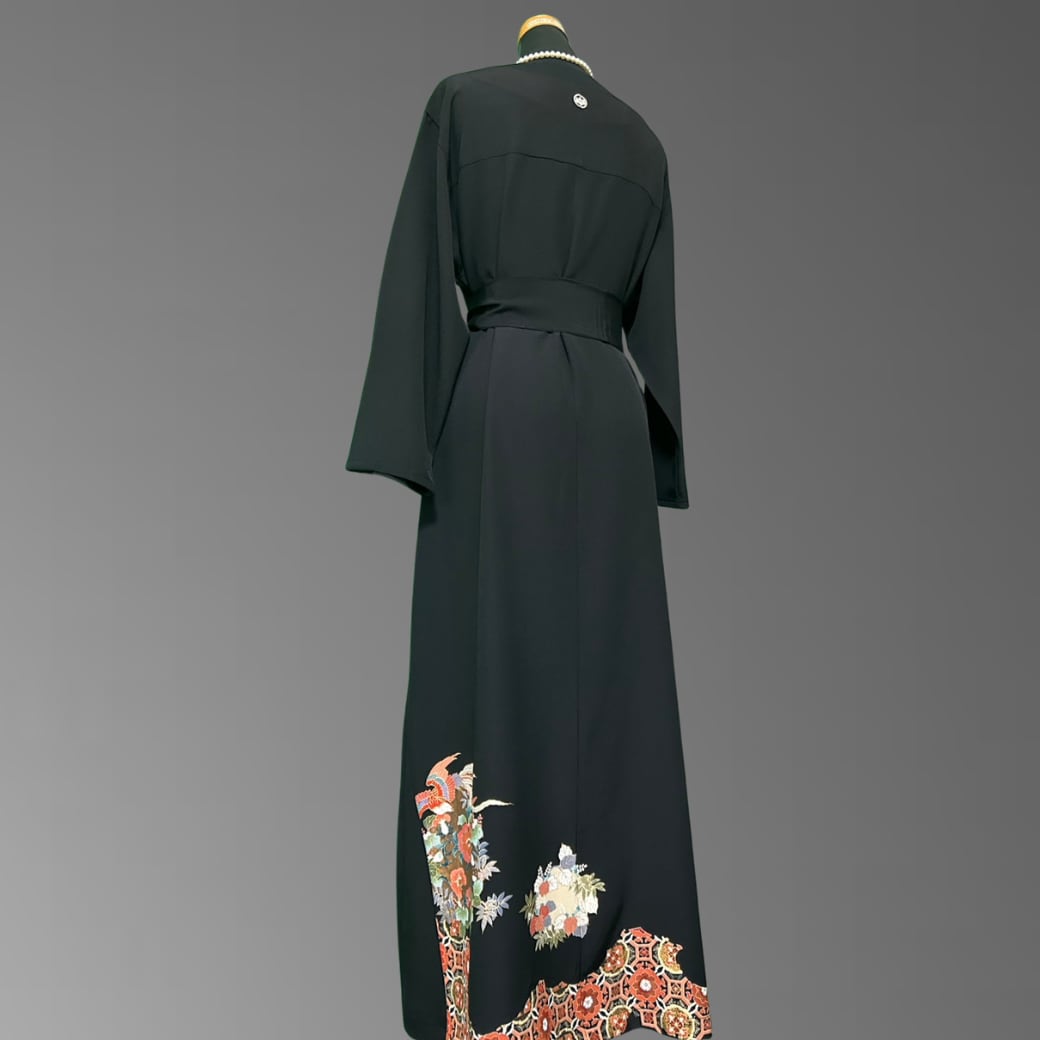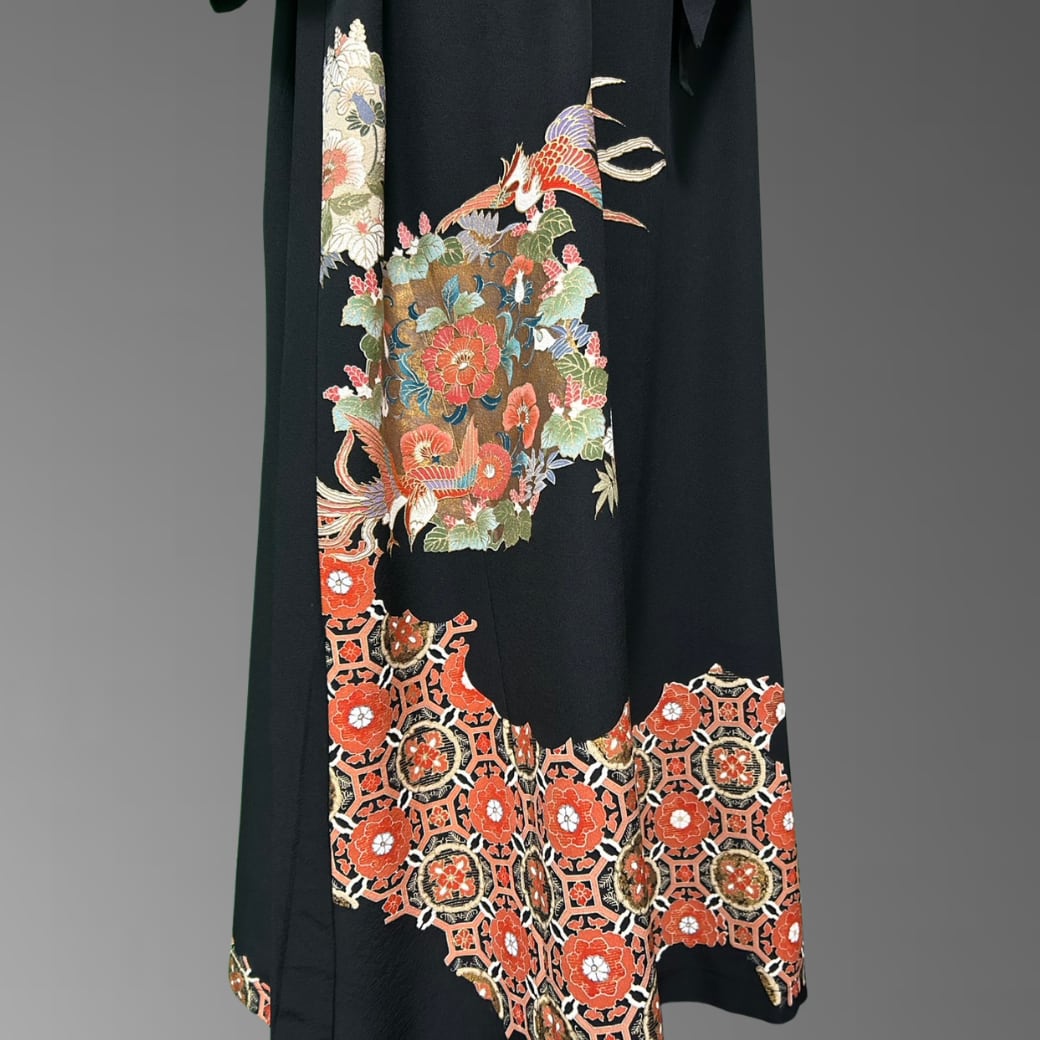 漆黒の地に舞う鳳凰と、連なる花輪文様。