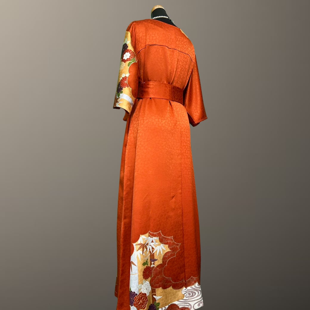 あたたかみのある橙色に金彩がきらめく、華やかで上品な一着。