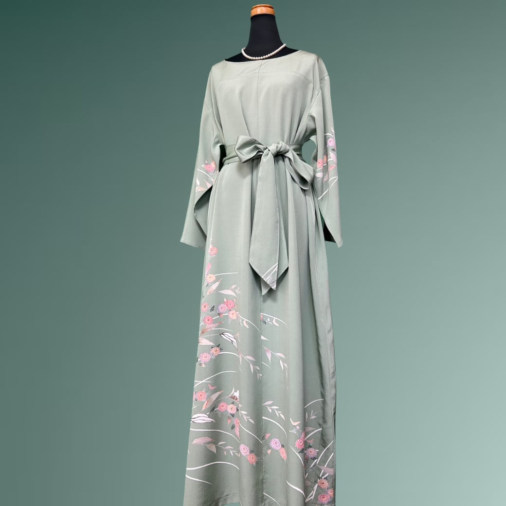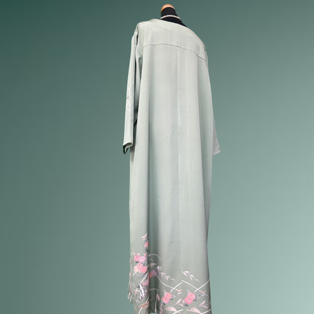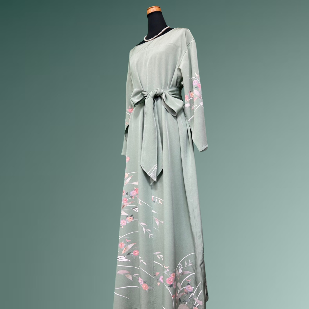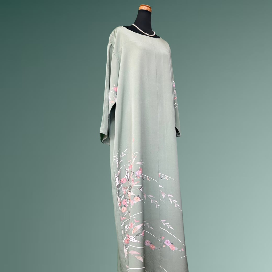 やわらかな若草色の地に、小菊と桔梗が風にそよぐように描かれた一着。