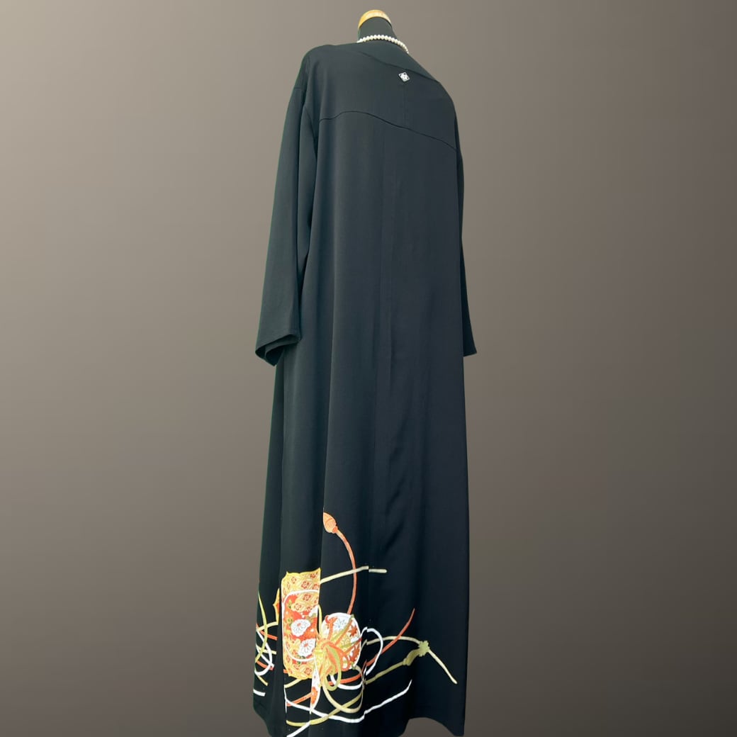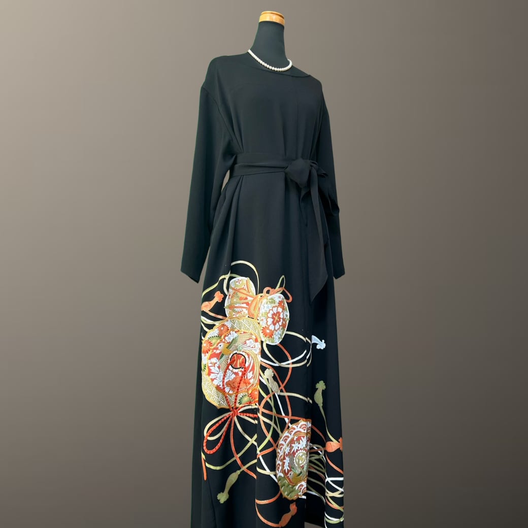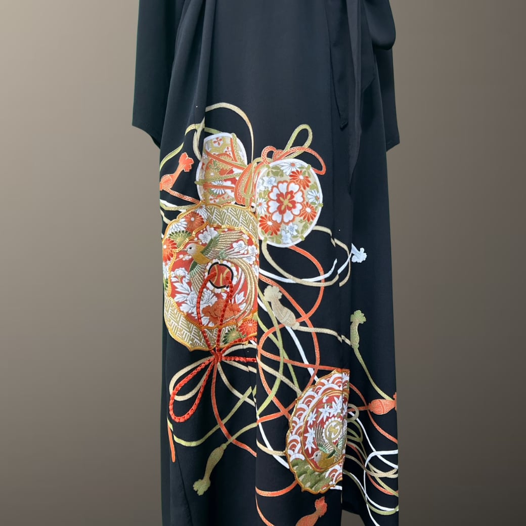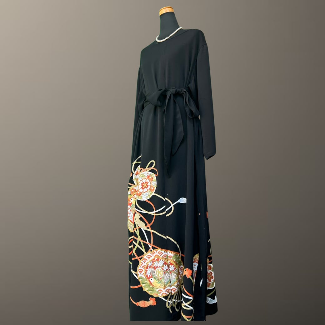 黒留袖 一部刺繍 鼓と鏡裏紋 着物ワンピース
