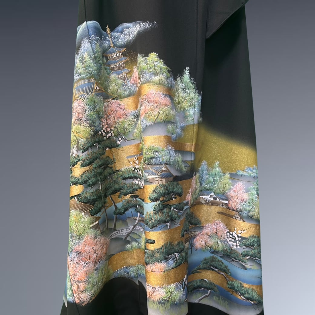 こちらは、京都・東寺の五重塔と豊かな自然を金彩で描いた、荘厳さとやわらかさを併せ持つ一着です。