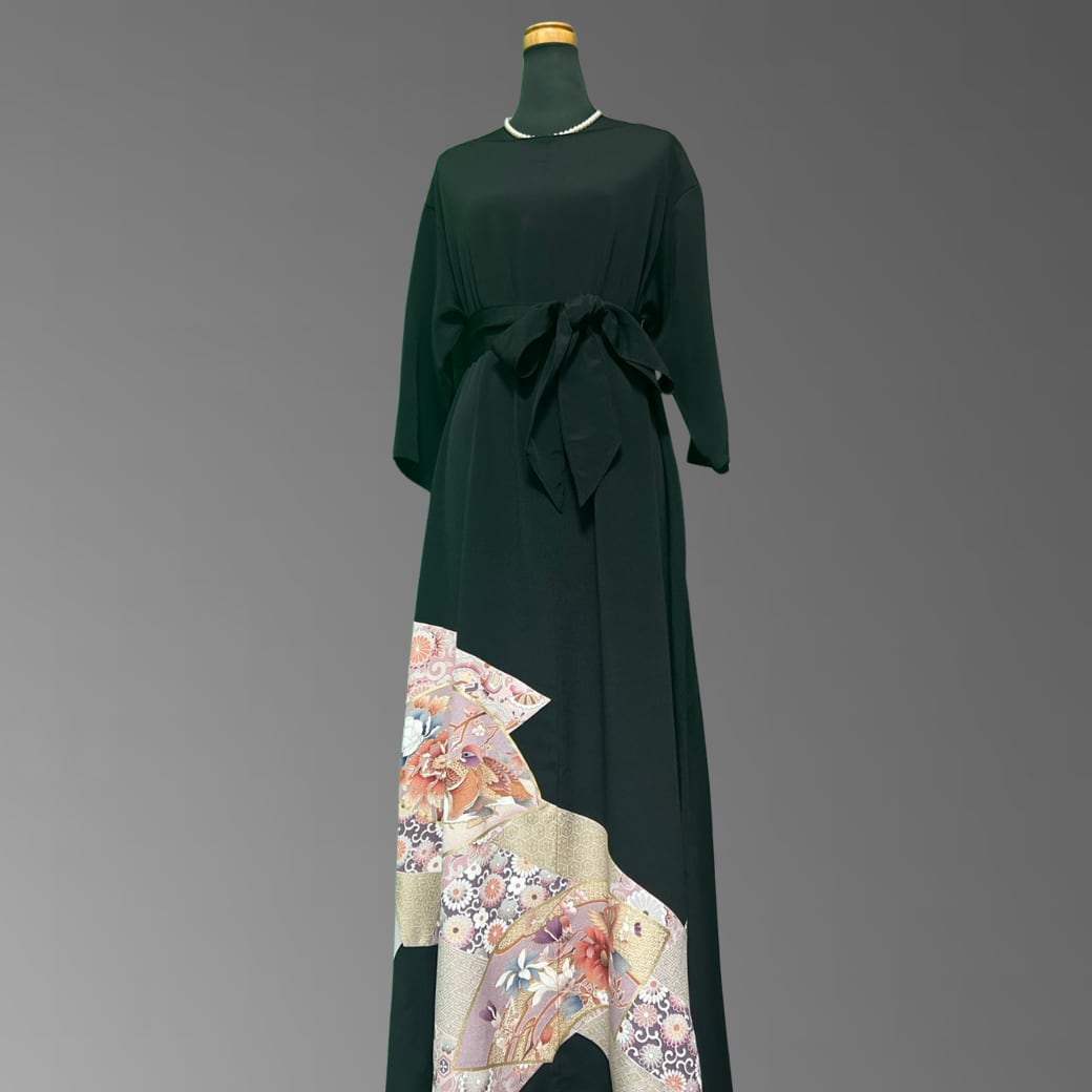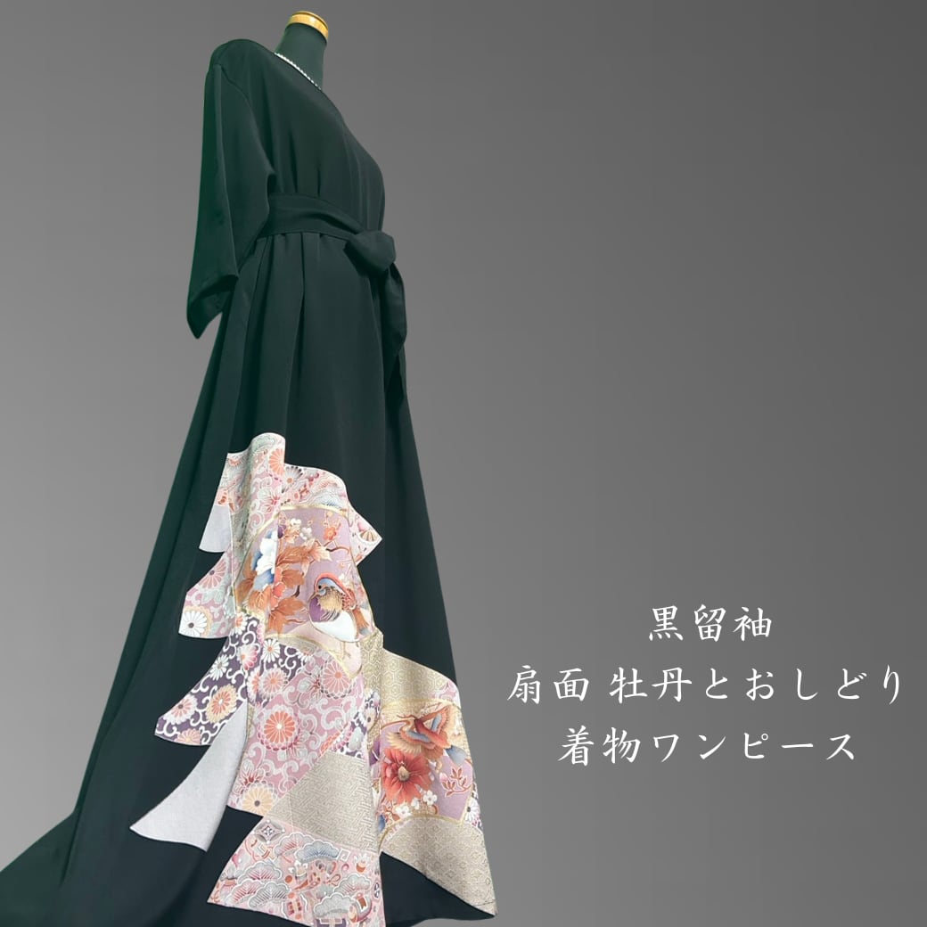 黒留袖 扇面 牡丹とおしどり 着物ワンピース
