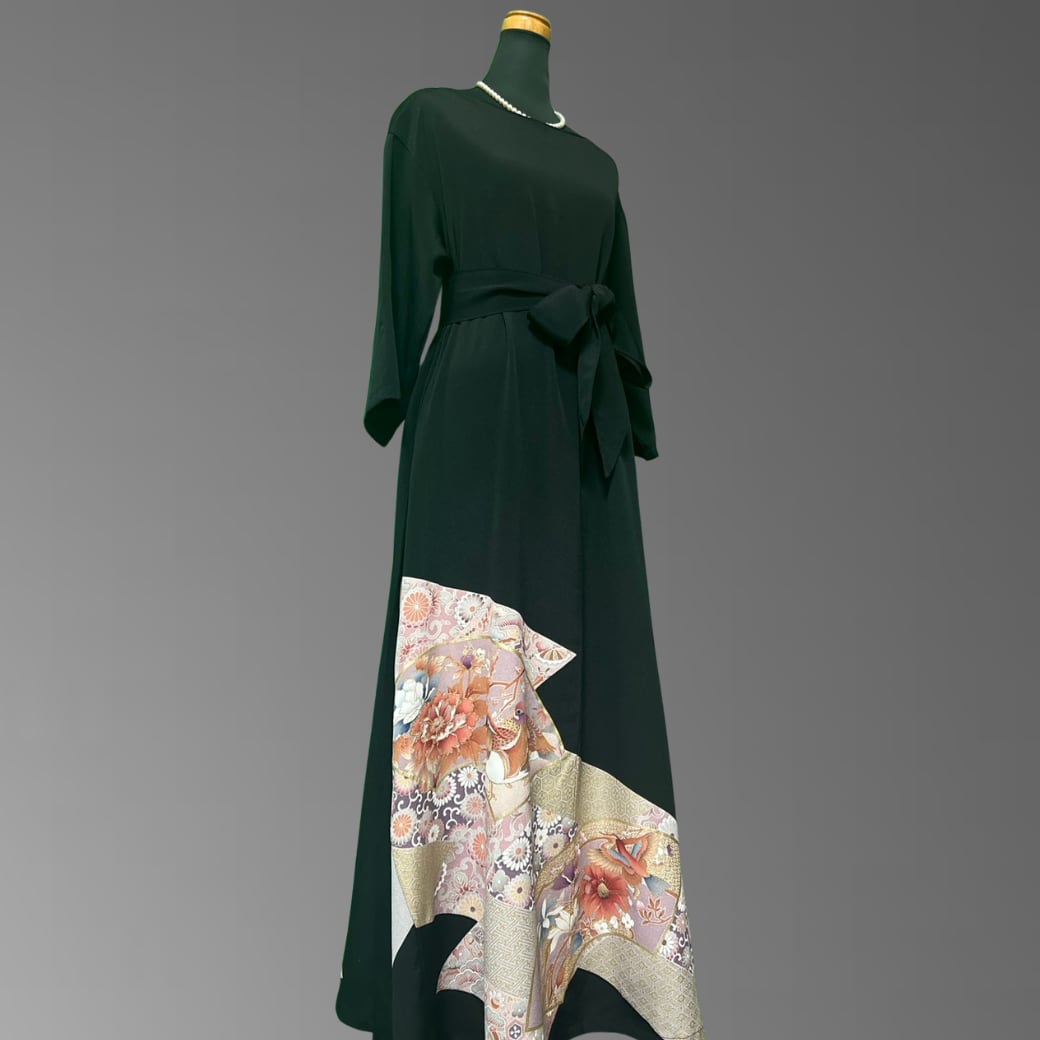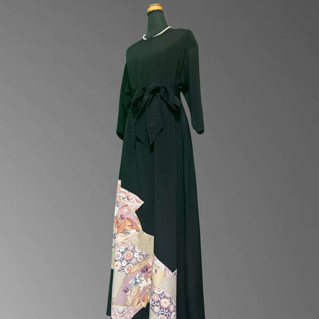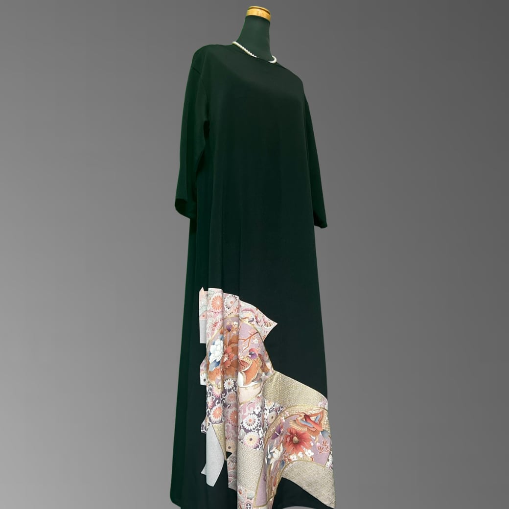 その中に描かれた花鳥の世界が、まるで物語のように広がる格式と気品を兼ね備えた、黒留袖の着物ワンピースです。
