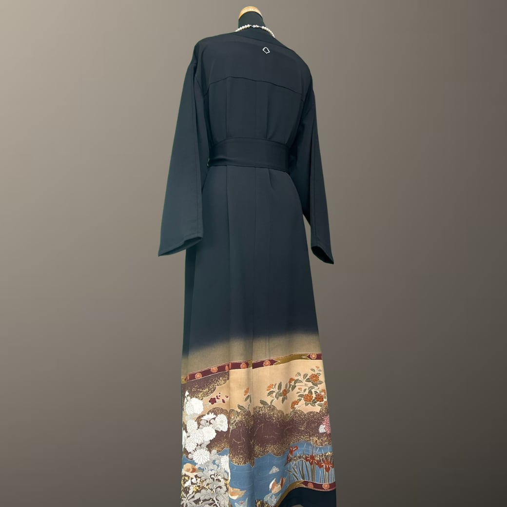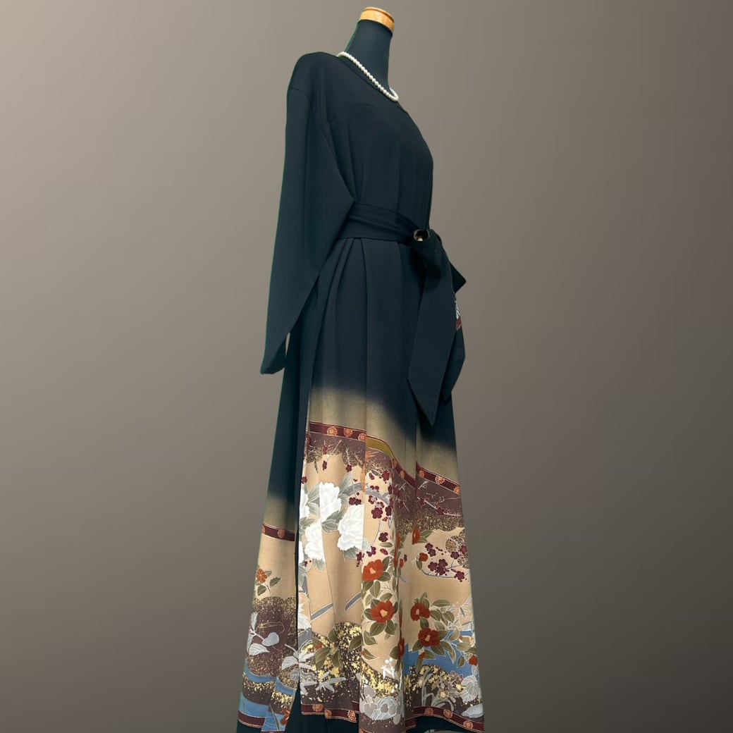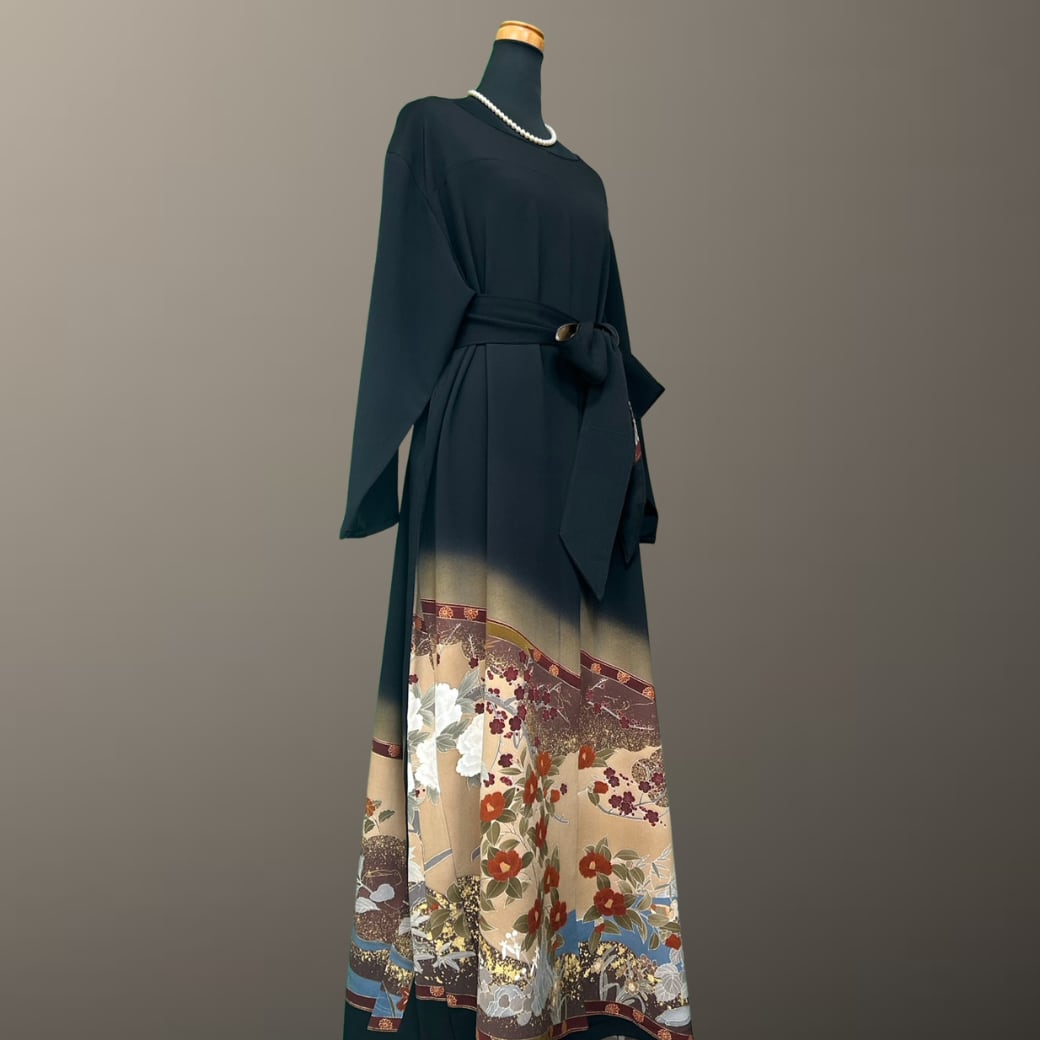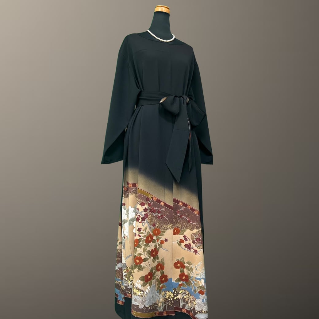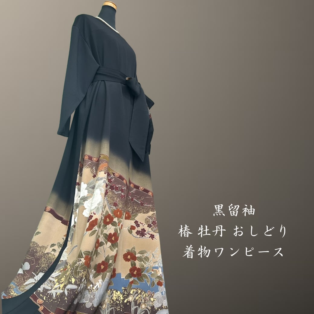 黒留袖ならではの深い黒を背景に、椿・牡丹・おしどりが流れるように描かれた、上質で存在感のある着物ワンピースです。