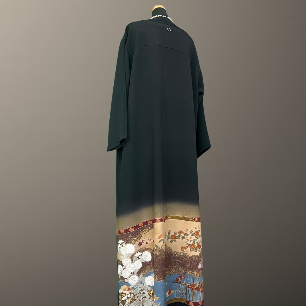 落ち着いた黒の中に柔らかな色彩が浮かび上がり、歩くたびに裾模様が美しく揺れ、華やぎと品格を同時に纏える一着に仕上がりました。