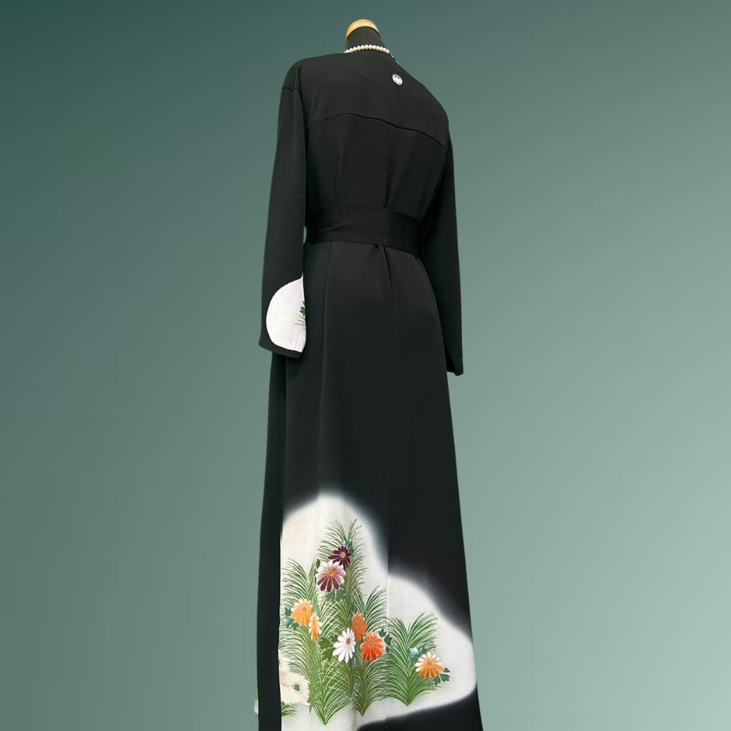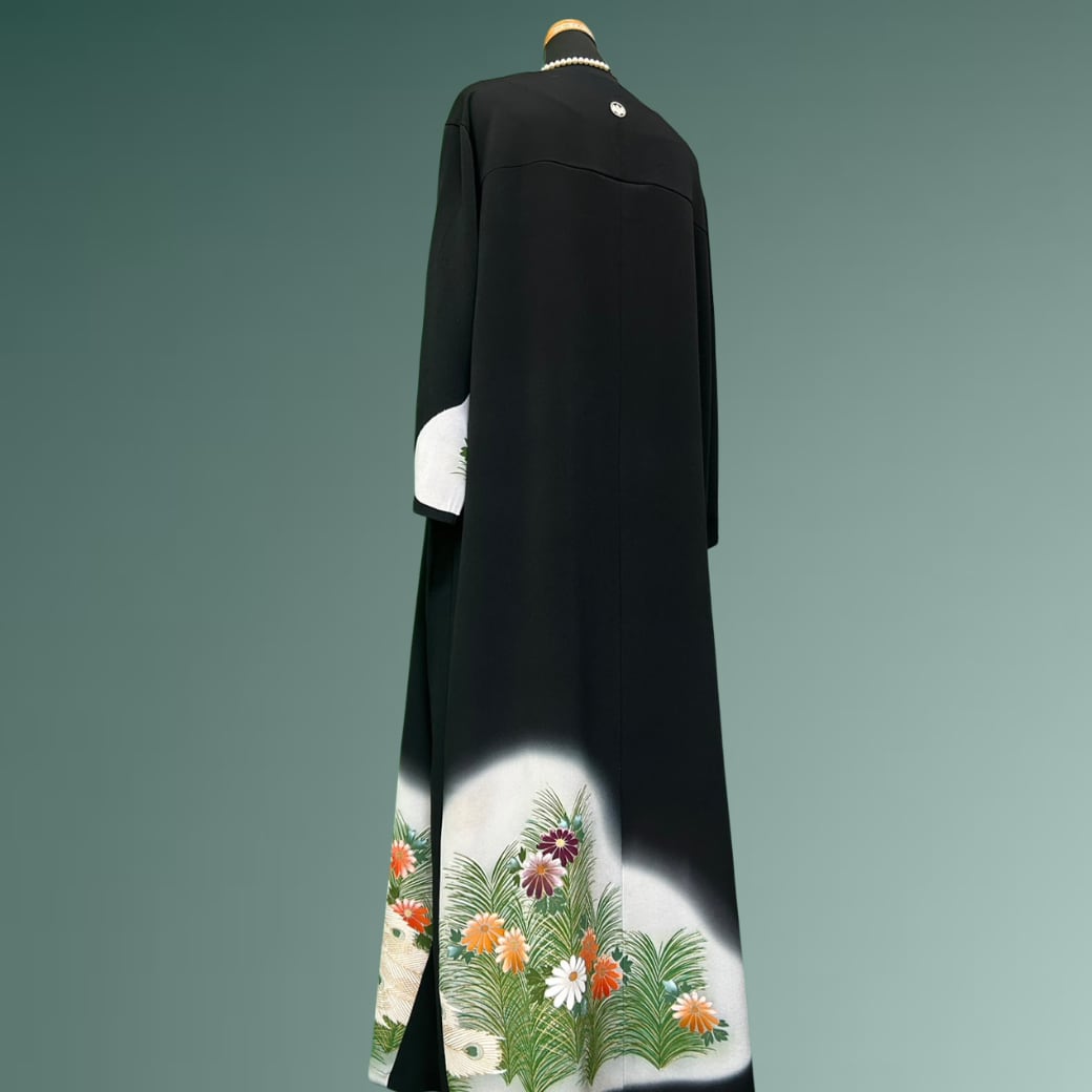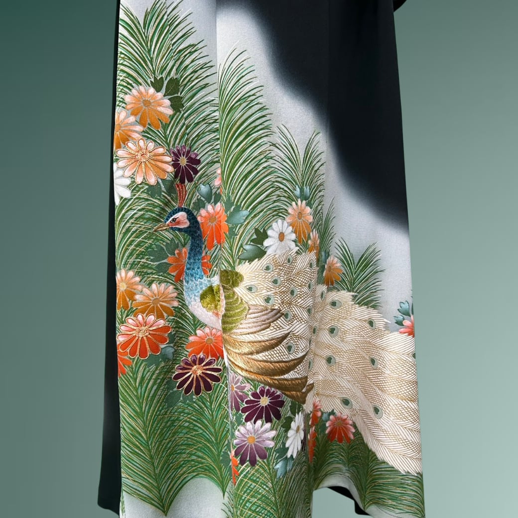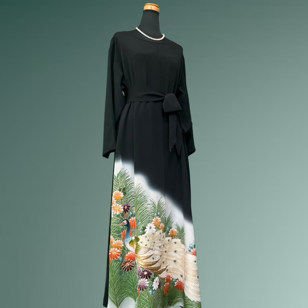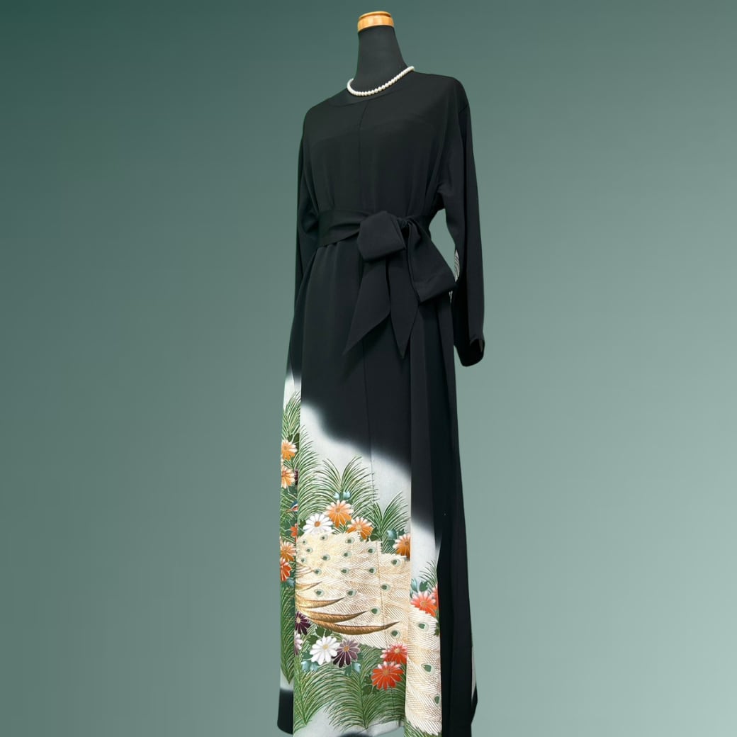 こちらの着物ワンピースは、黒留袖ならではの深い気品をまといながら、その裾いっぱいに広がる孔雀と菊の意匠が、ひと目で特別と分かる存在感を放つ一着です。