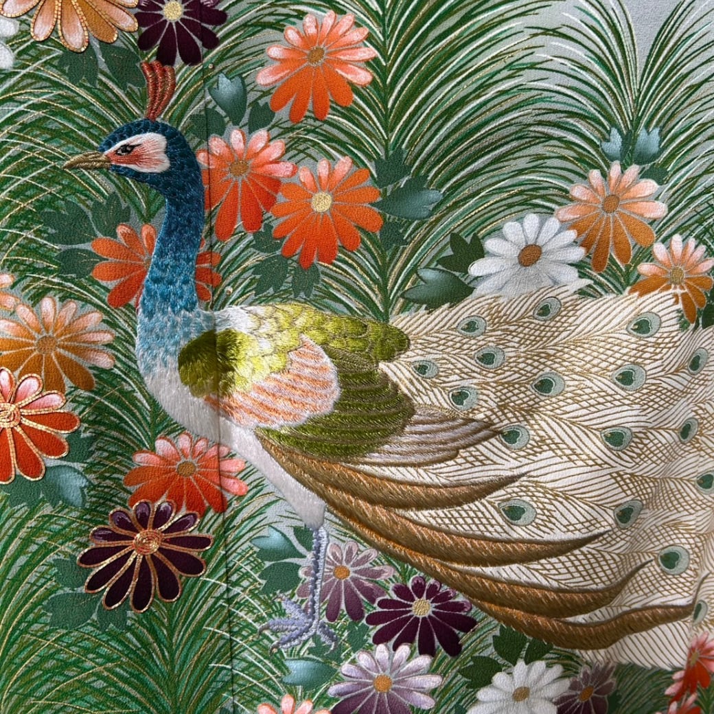 白羽を繊細な刺繍で表現した孔雀は、古来より「吉祥」「気高さ」「福を呼ぶ象徴」とされ、特にその広がる羽根は繁栄や華やぎを表すおめでたいモチーフ。