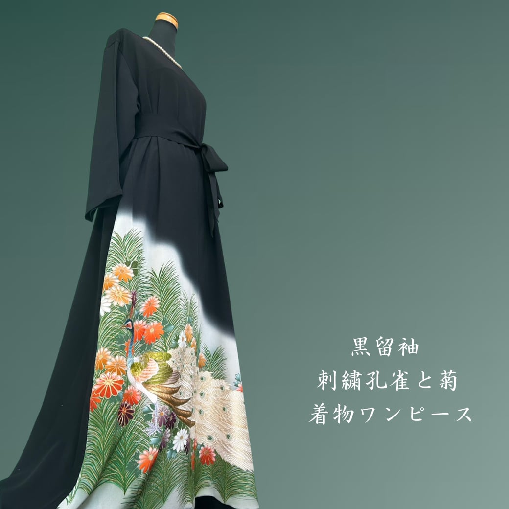 黒留袖 刺繍孔雀と菊 着物ワンピース