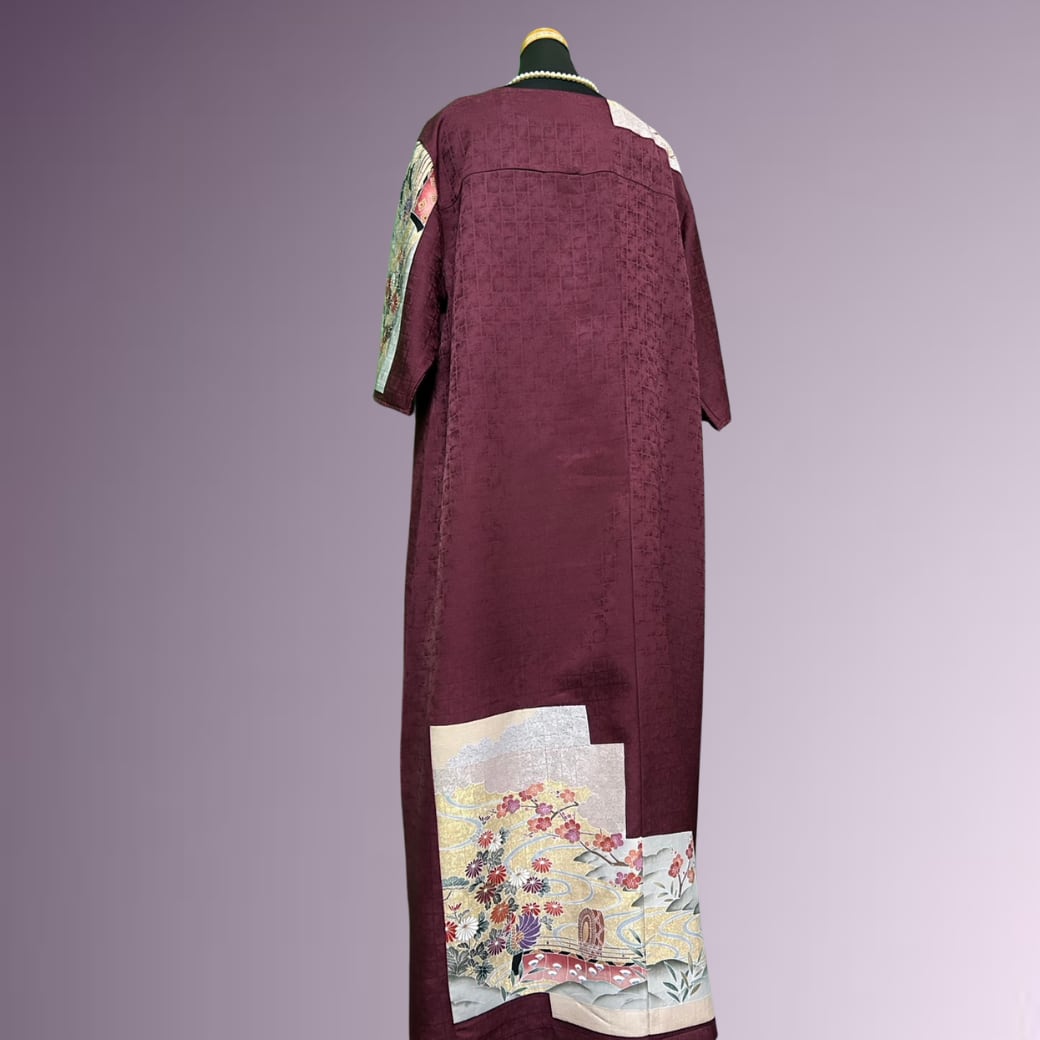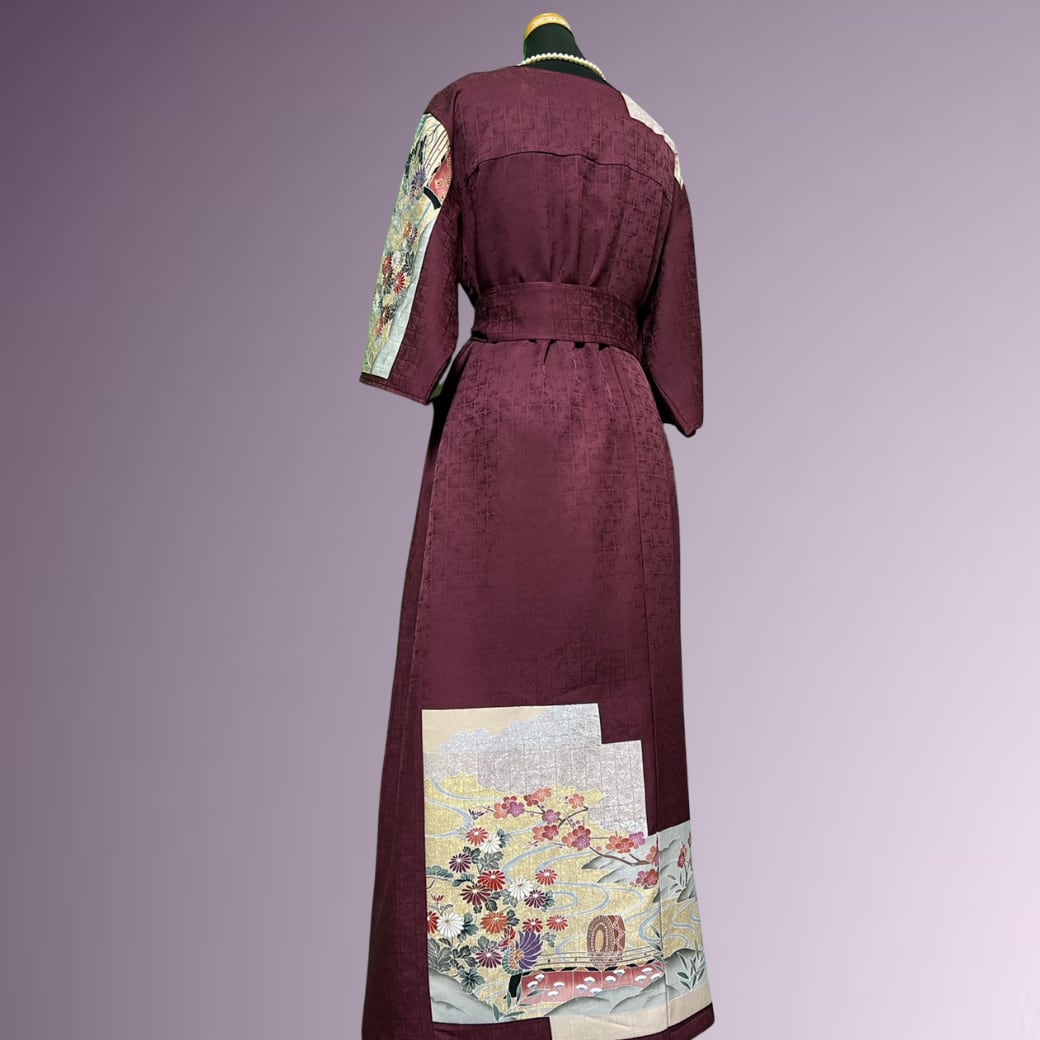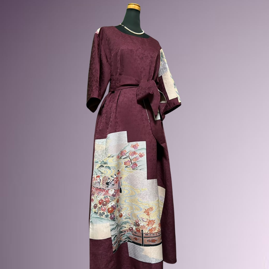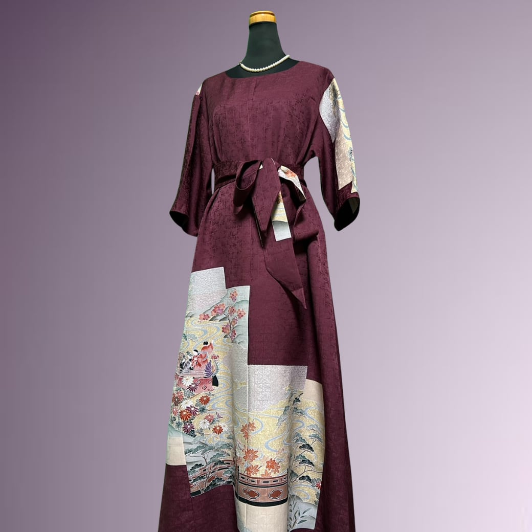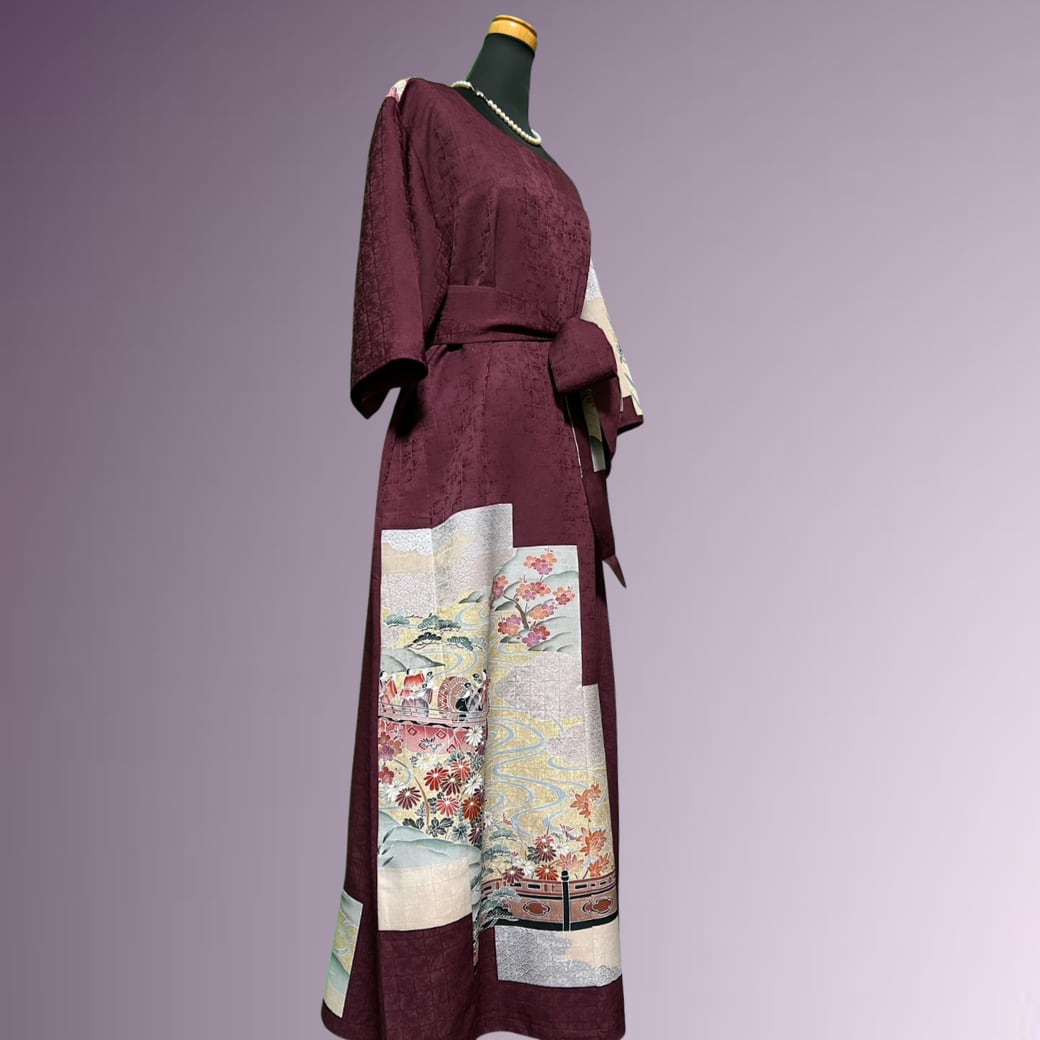 深みのある葡萄色の地に、雅やかな文様が重なるこちらの訪問着ワンピースは、古典意匠が持つ上質さと、洋のシルエットが融合した一着です。