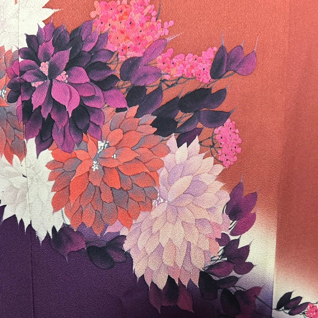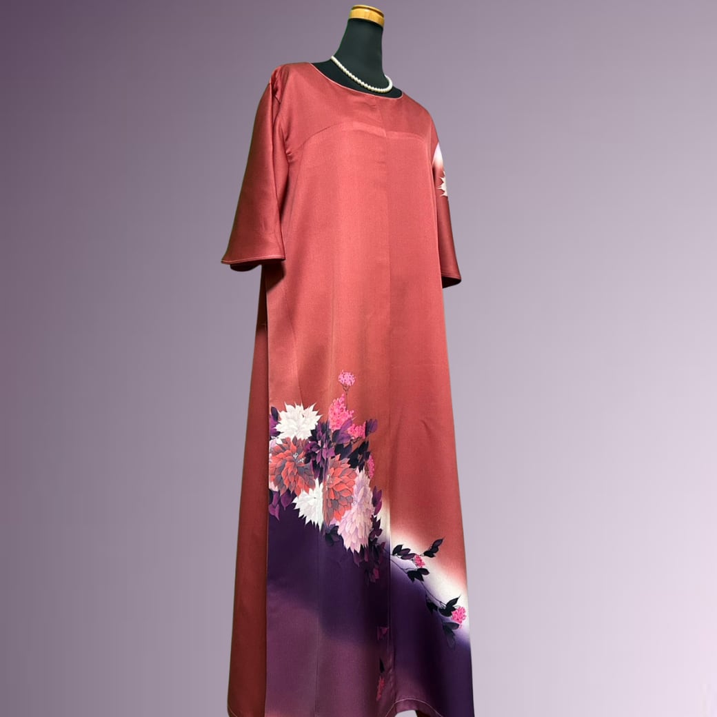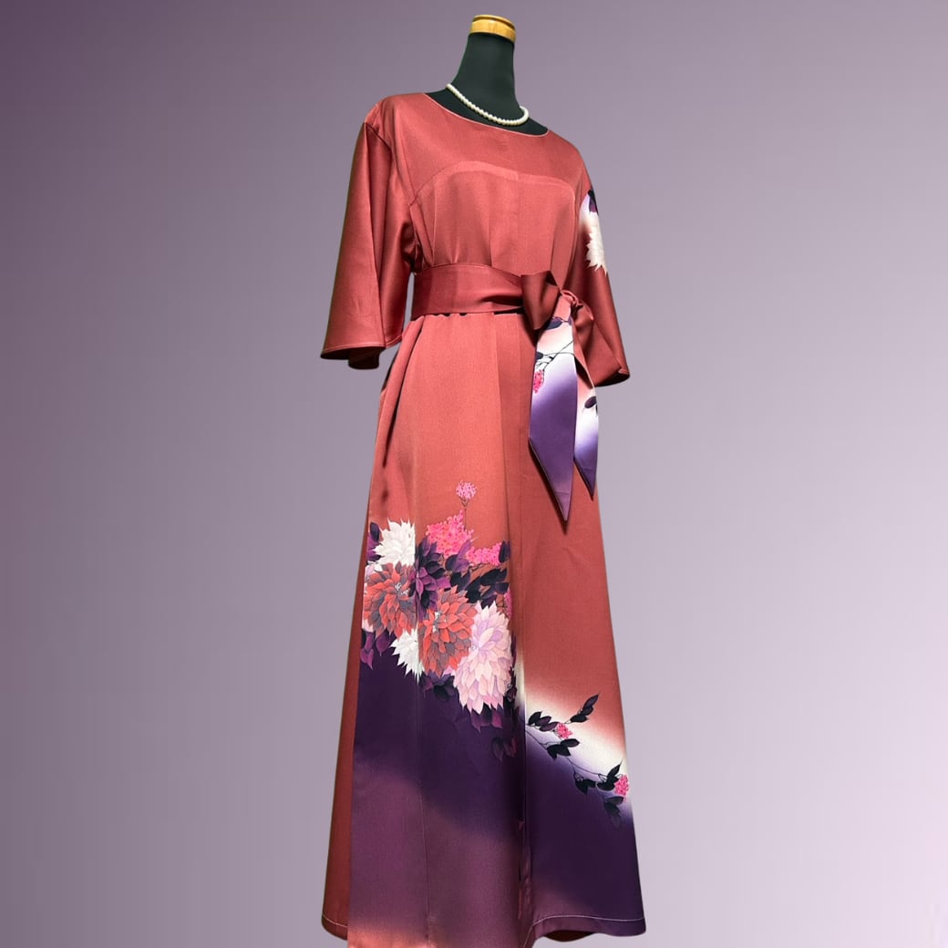 夕刻の空を思わせる深みのある赤紫のグラデーションに、華やかに咲き誇るダリアと柔らかなアナベルが描かれた訪問着からお仕立てした着物ワンピースです。