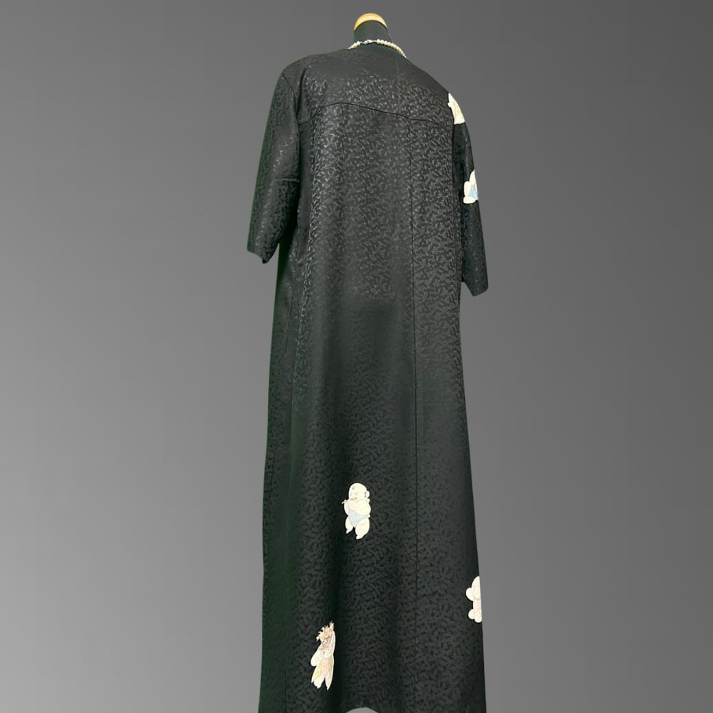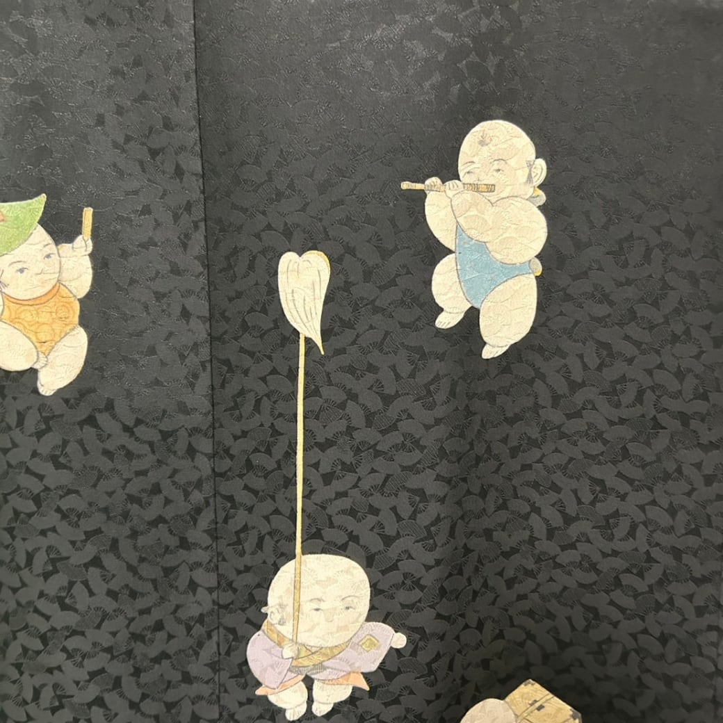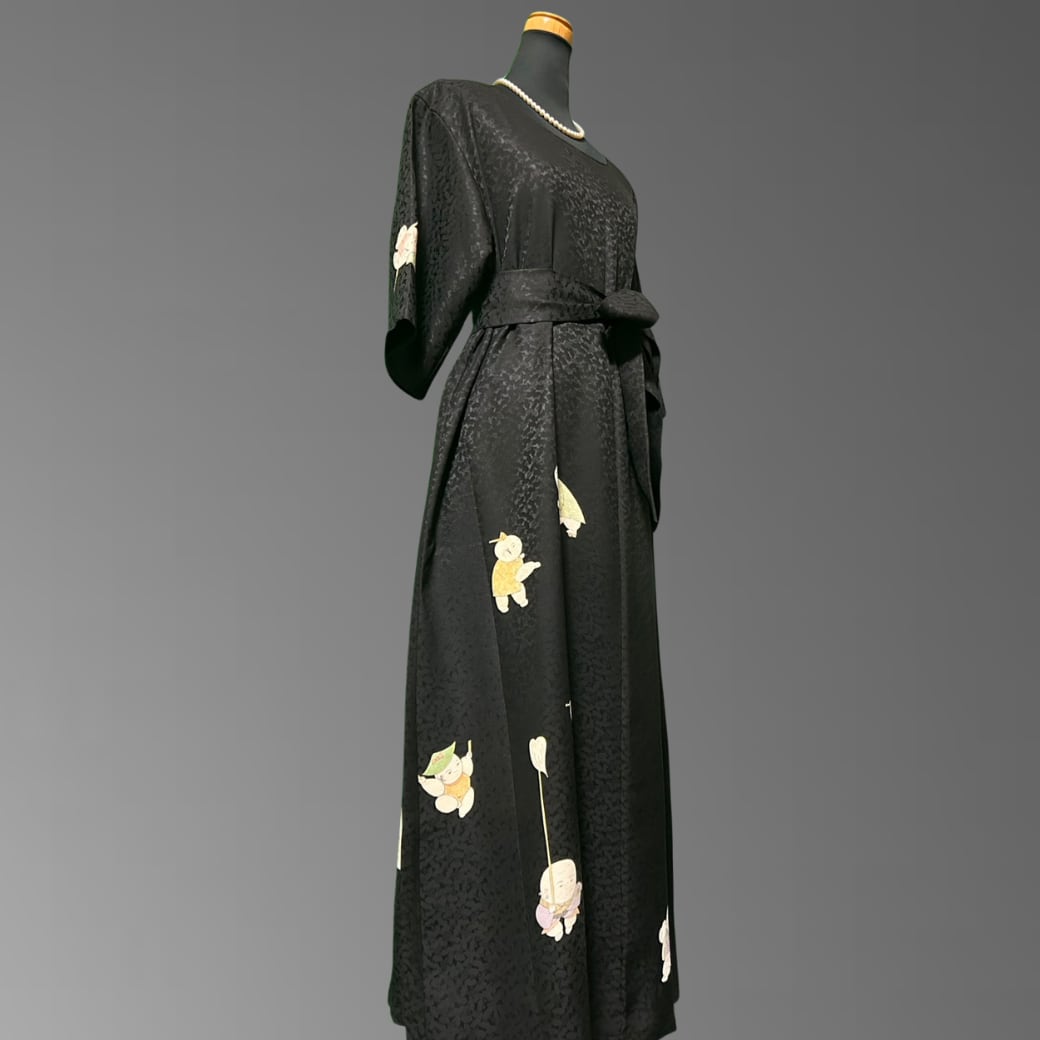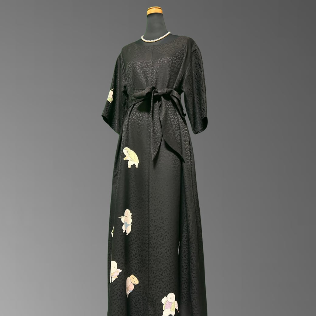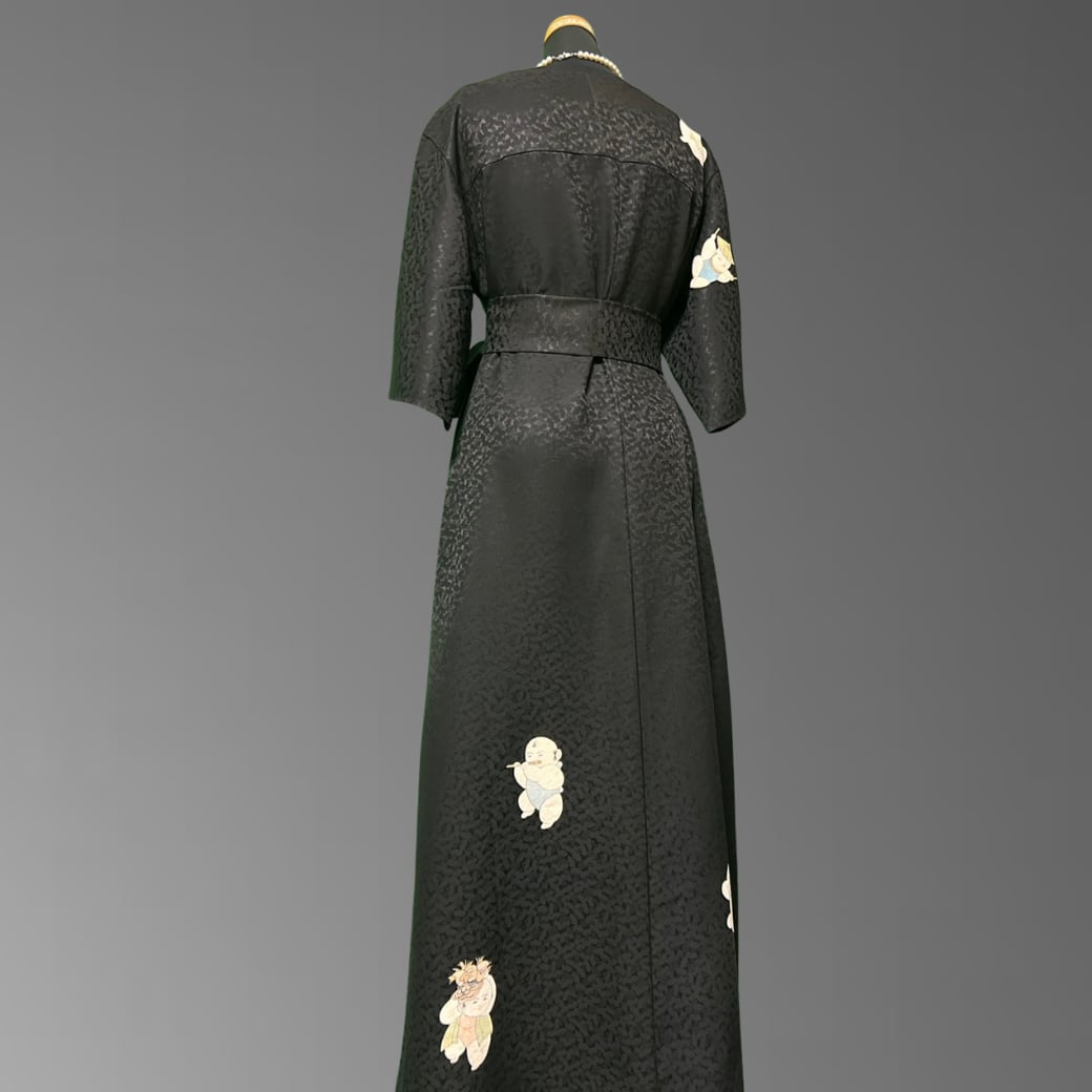 黒地に浮かぶ愛らしい御所人形が、上品な遊び心を添える一着。