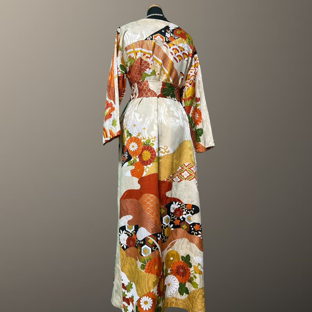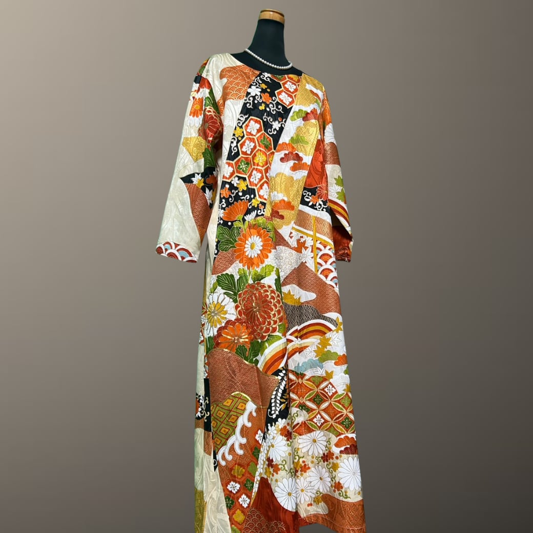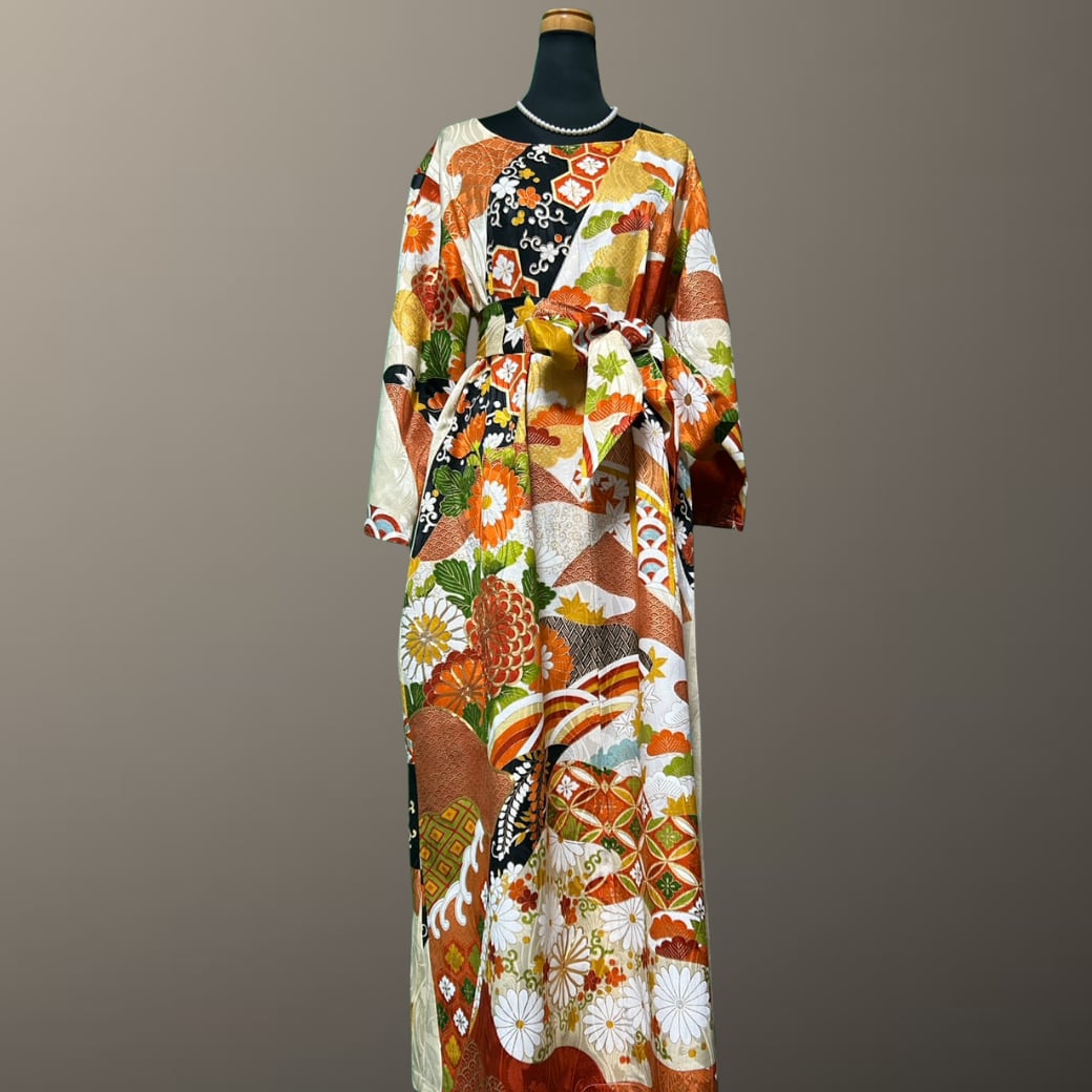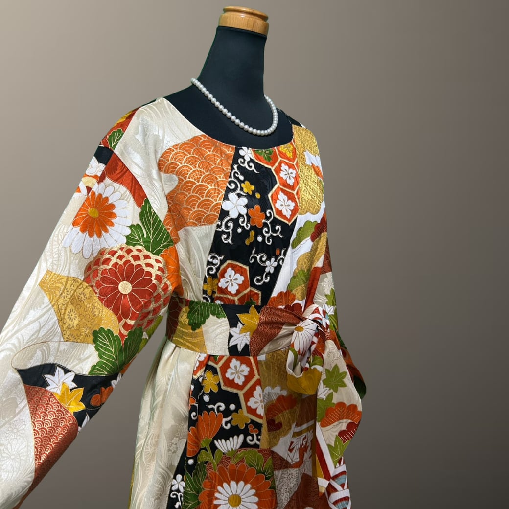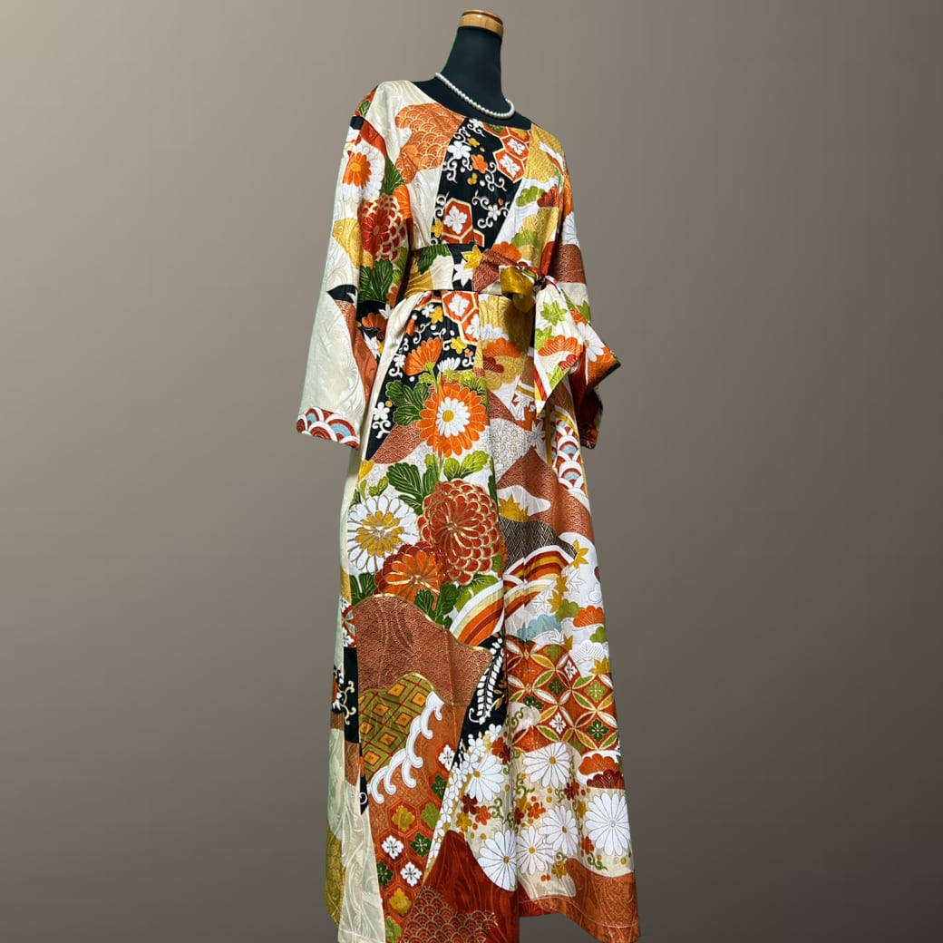菊や吉祥文様が華やかに咲き誇り、晴れやかな席にふさわしい存在感を放つ着物ワンピースです。