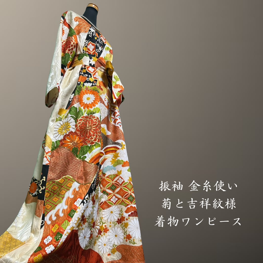 振袖 金糸使い 菊と吉祥紋様 着物ワンピース