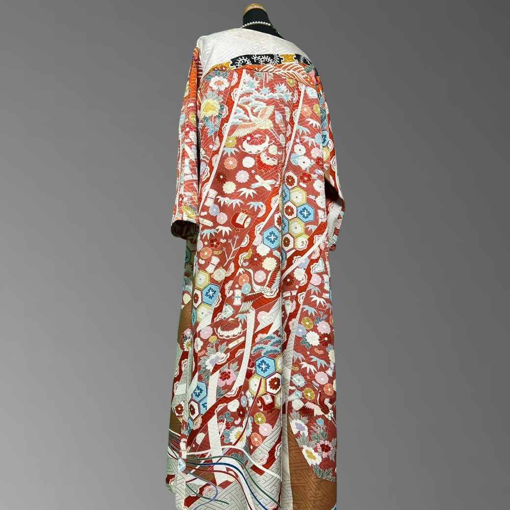 雅やかな檜扇と、縁起の良い宝尽くし文様が豪華に描かれた一着。