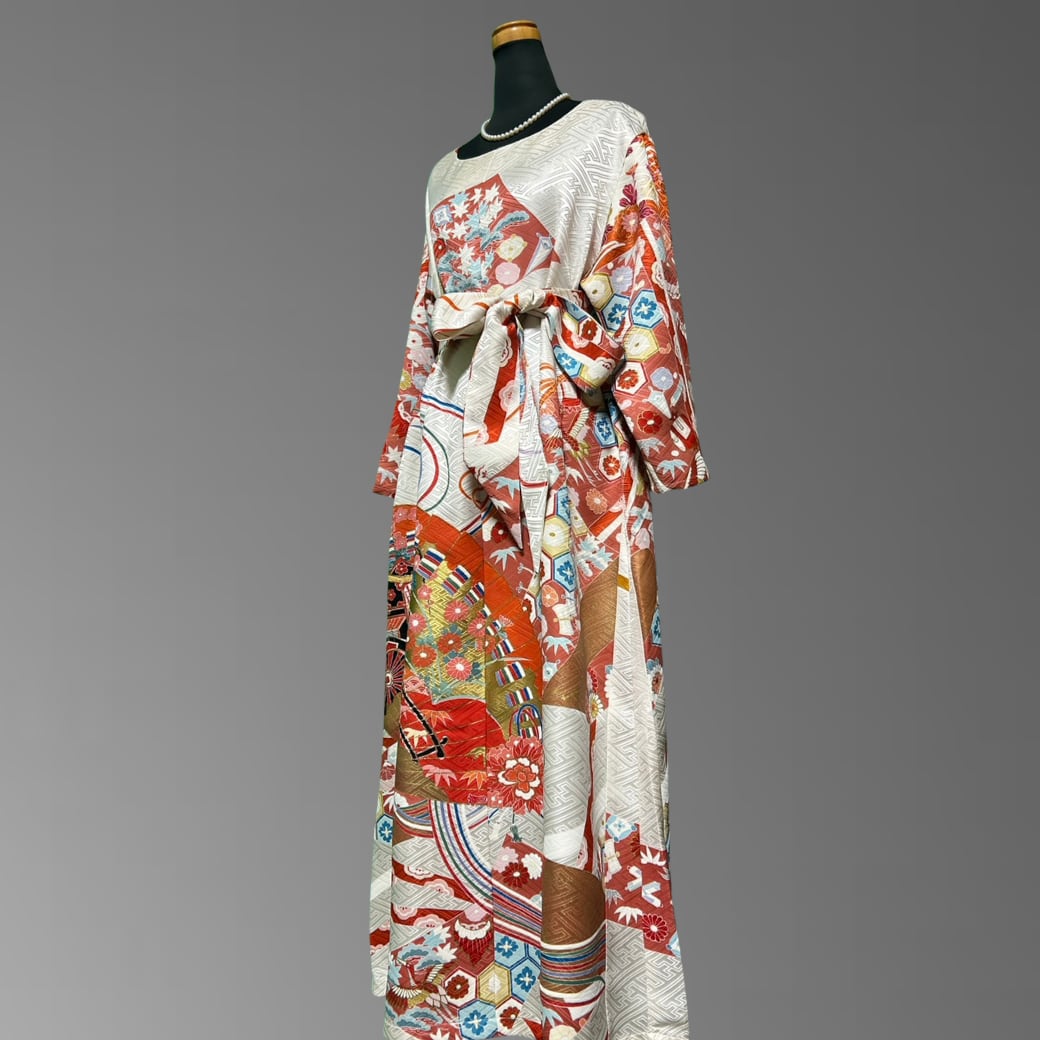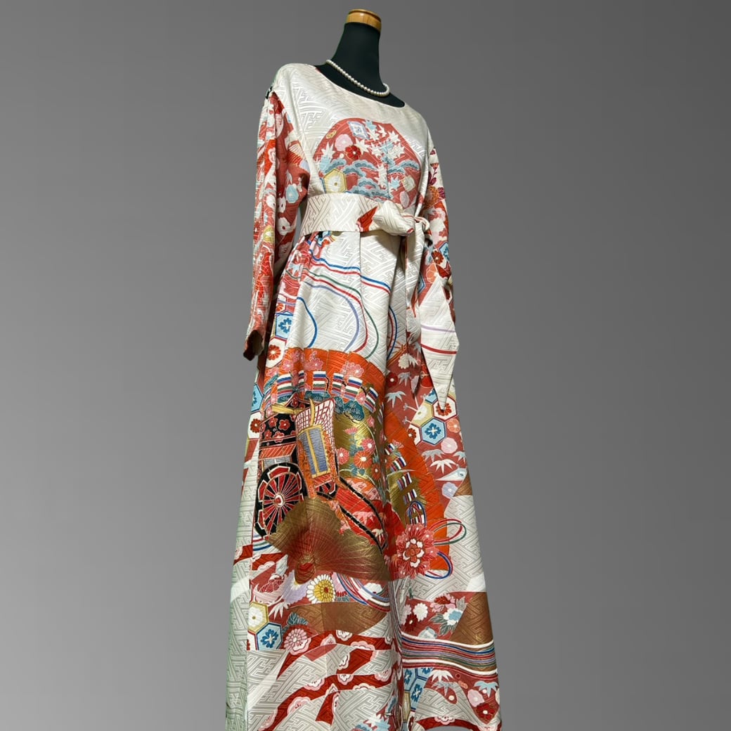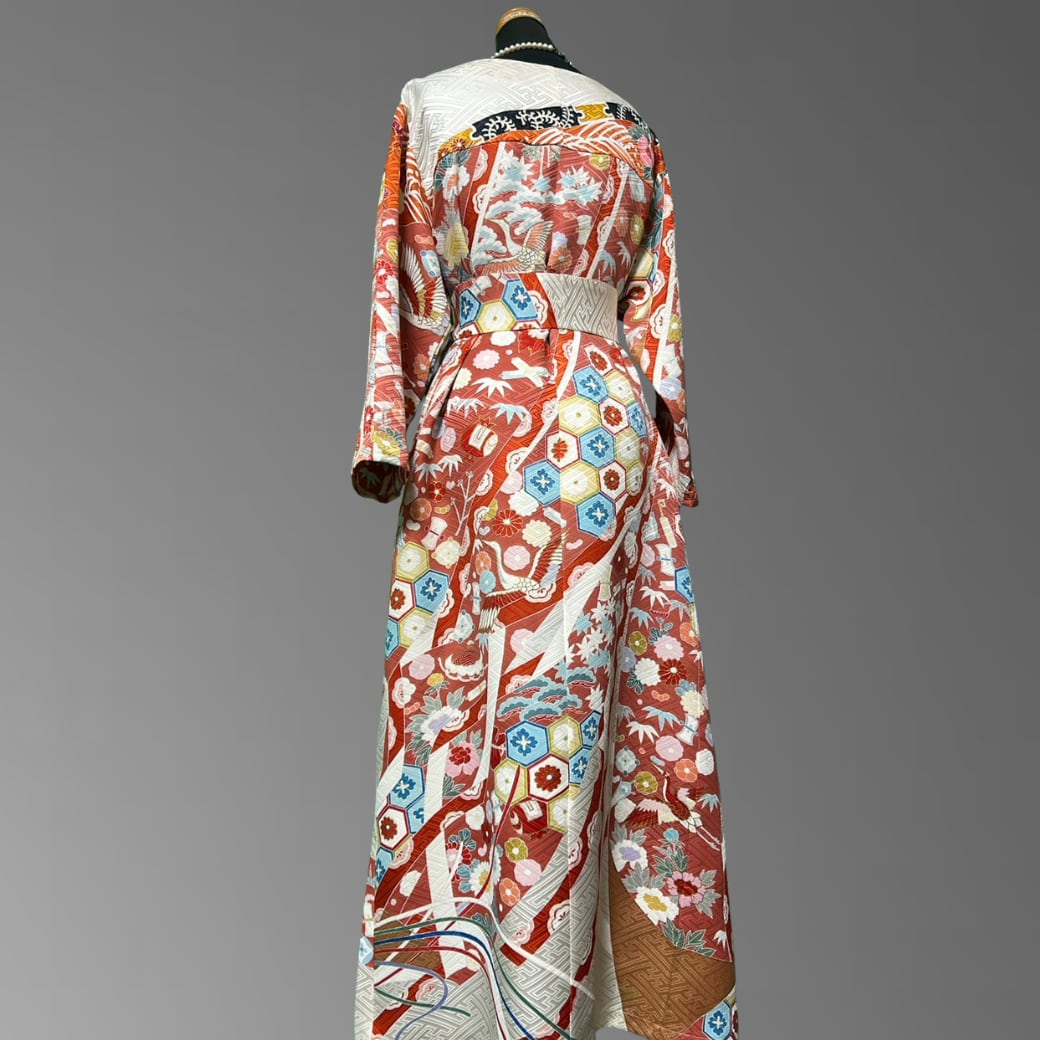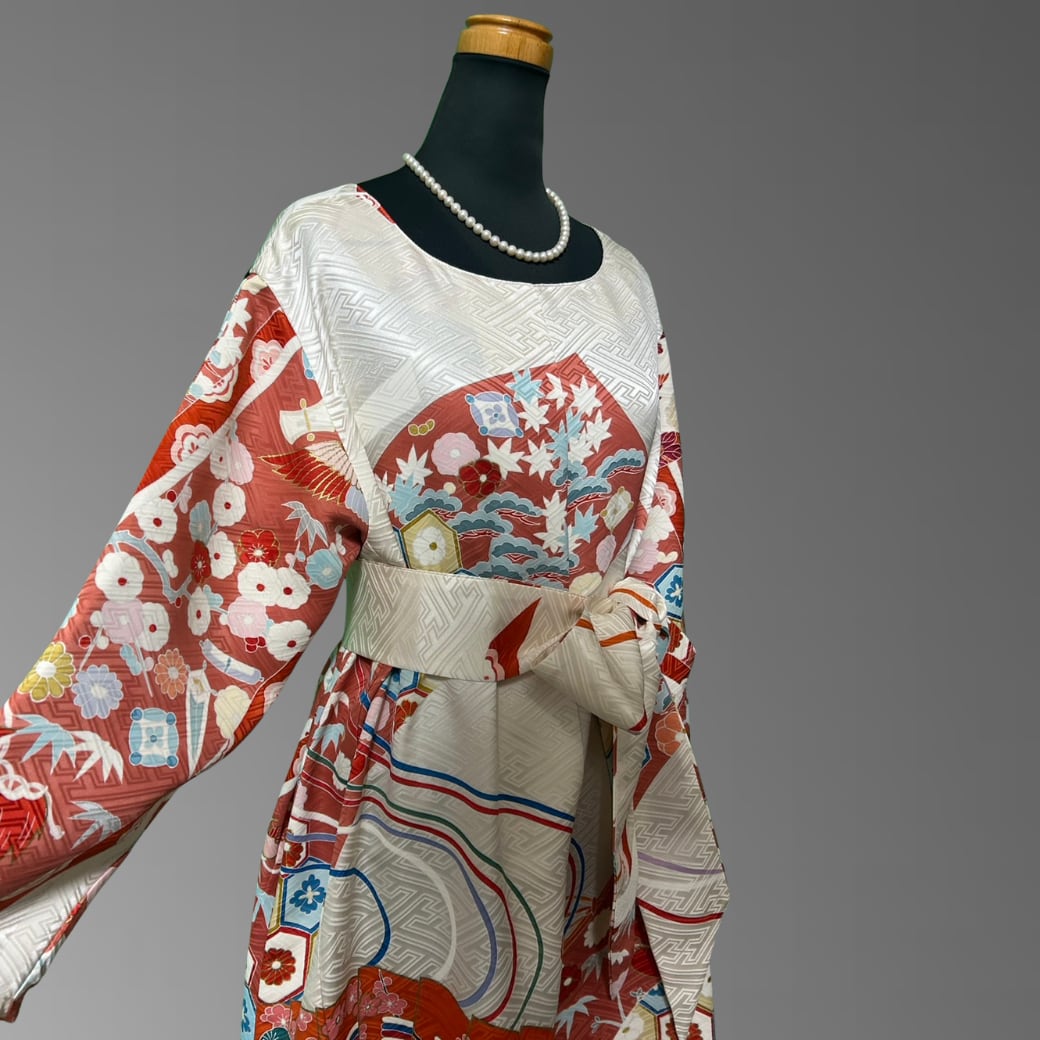 晴れの日にふさわしい華やかさと気品を纏う、振袖から仕立てた着物ワンピースです。