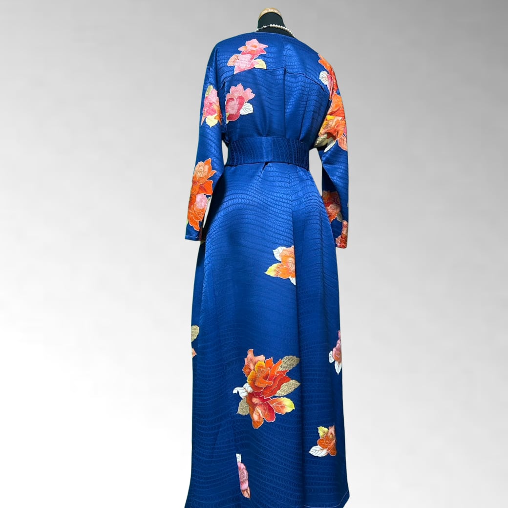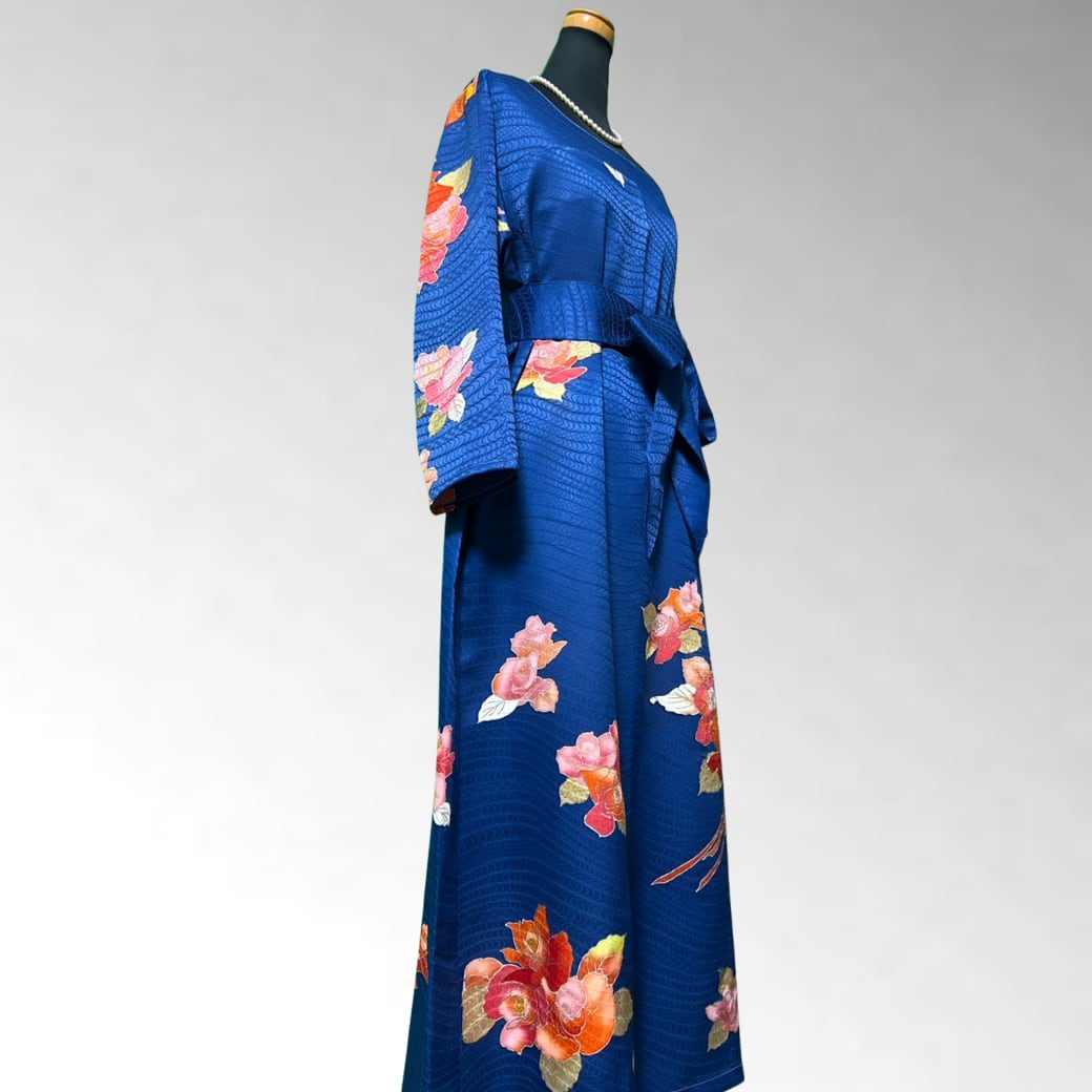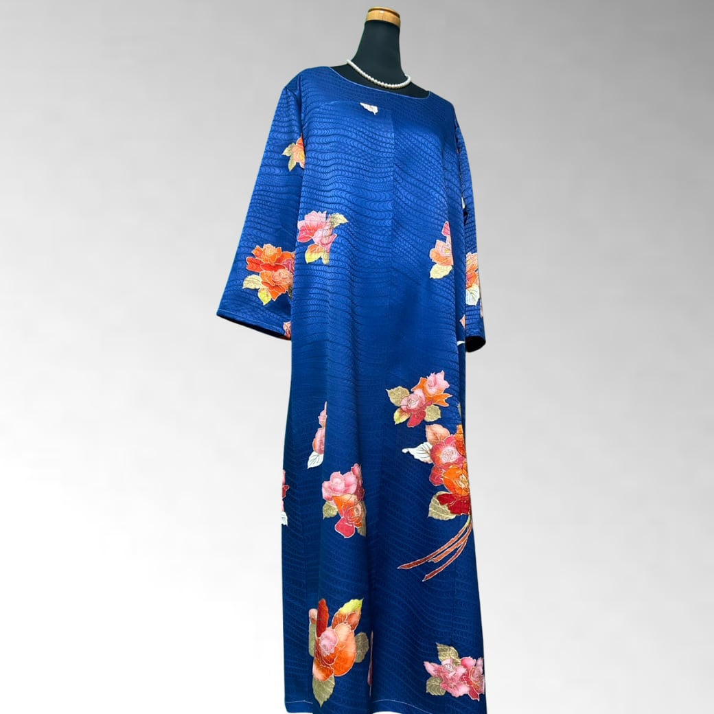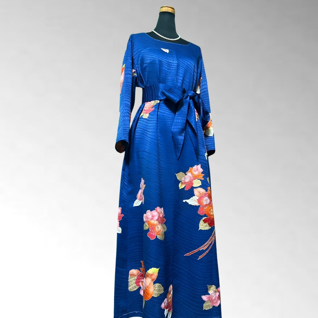 深い瑠璃色の上に、華やかな薔薇が咲き誇る一着。