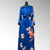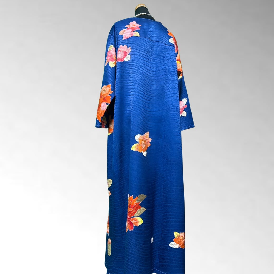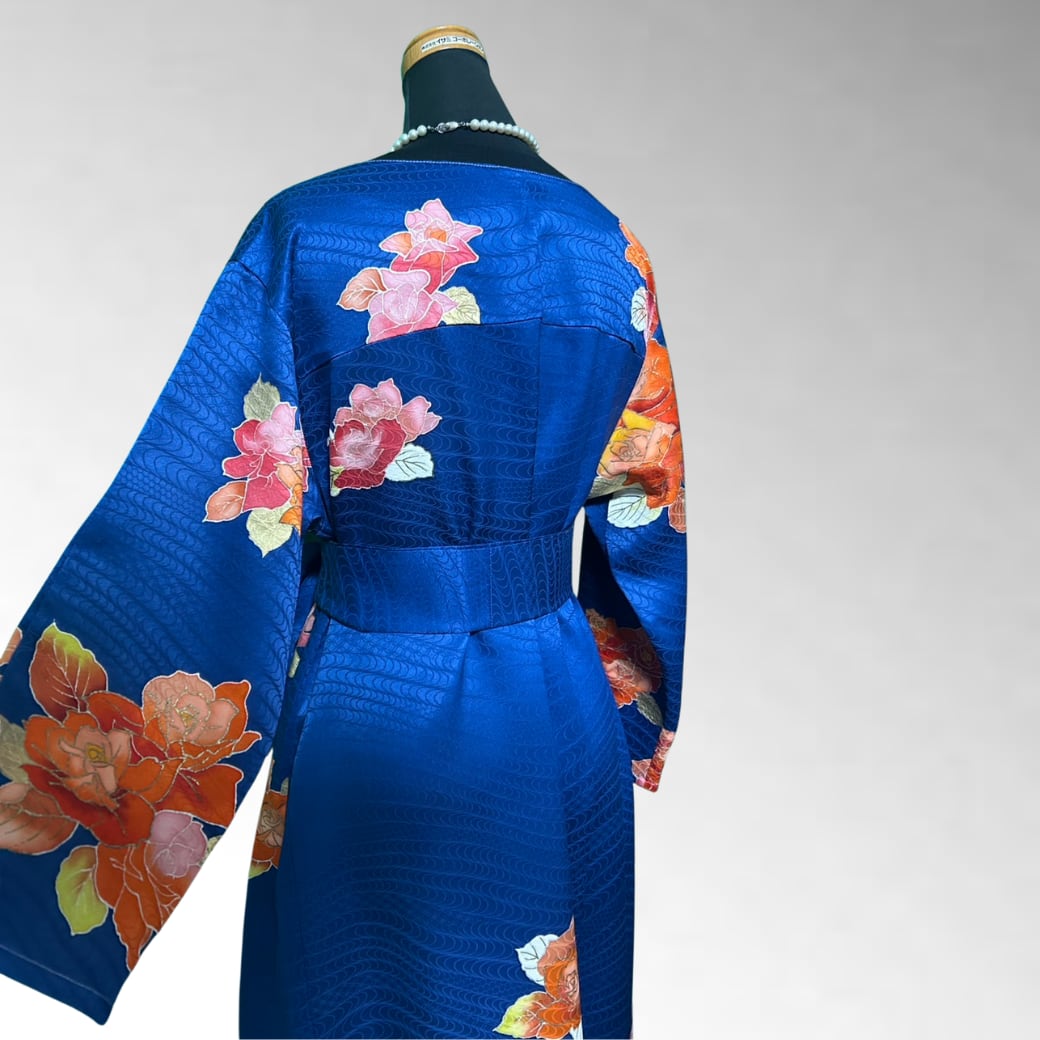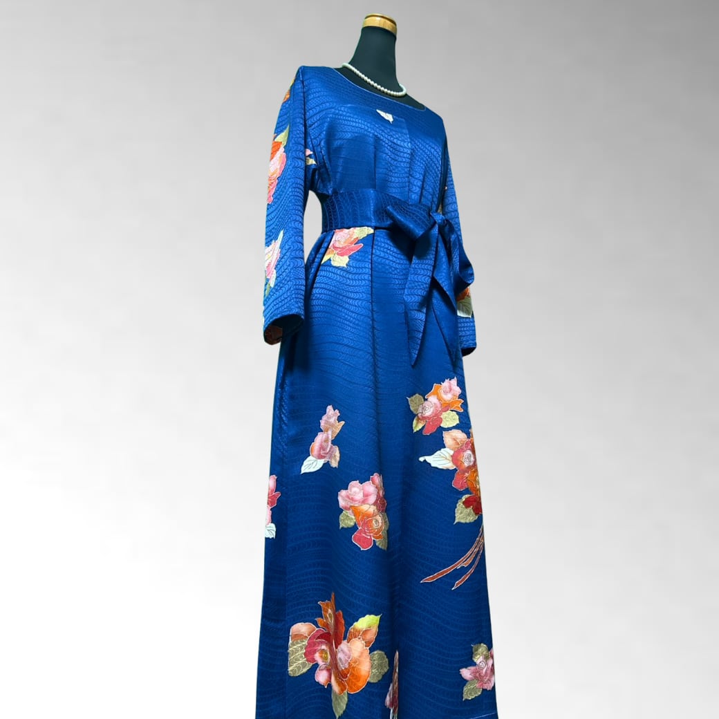 深い瑠璃色の上に、華やかな薔薇が咲き誇る一着。