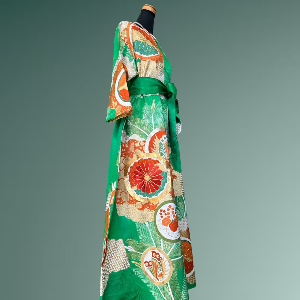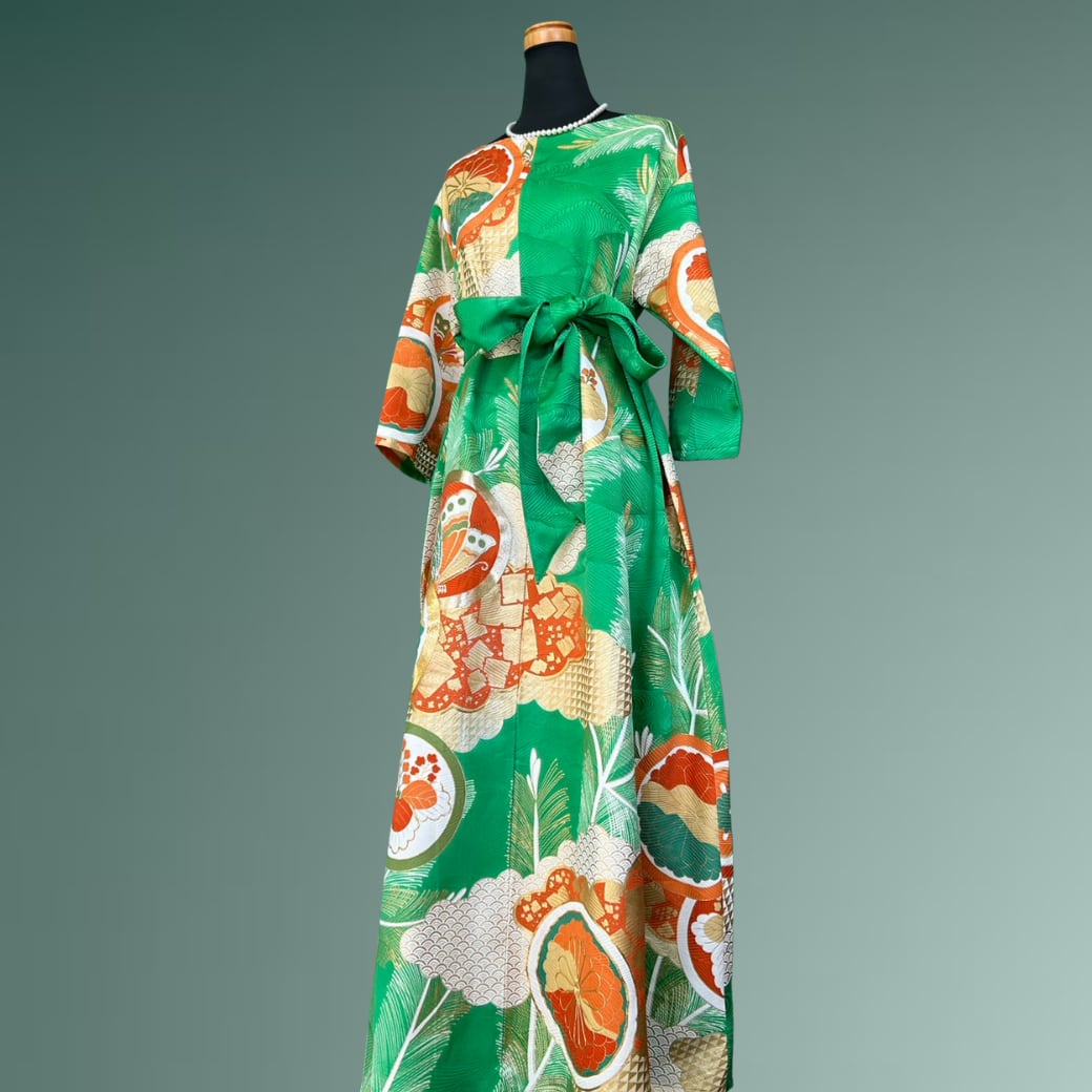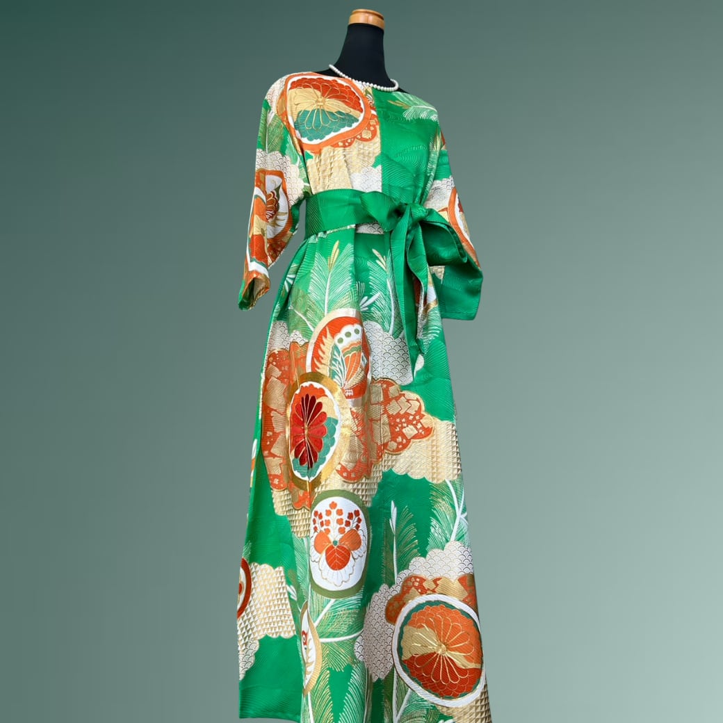 鮮やかな翡翠色に、雲のように柔らかく広がる雲取りが映える、振袖から生まれた着物ワンピースです。