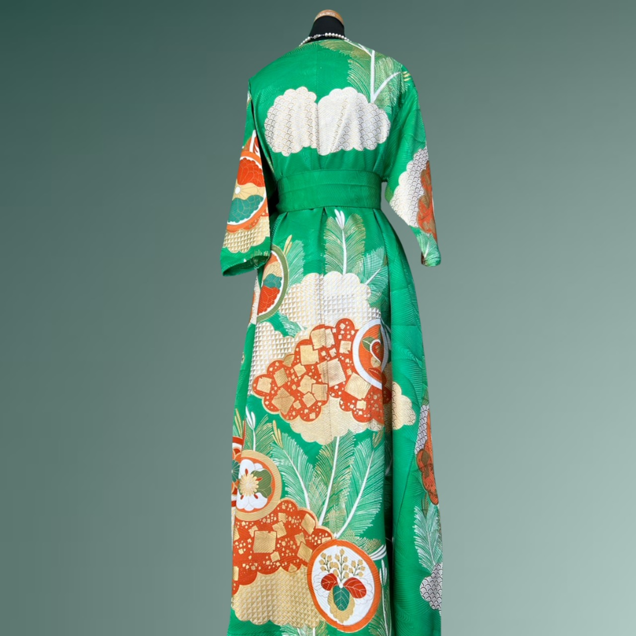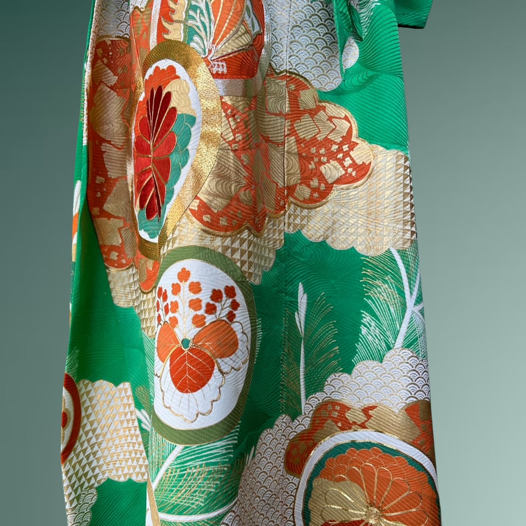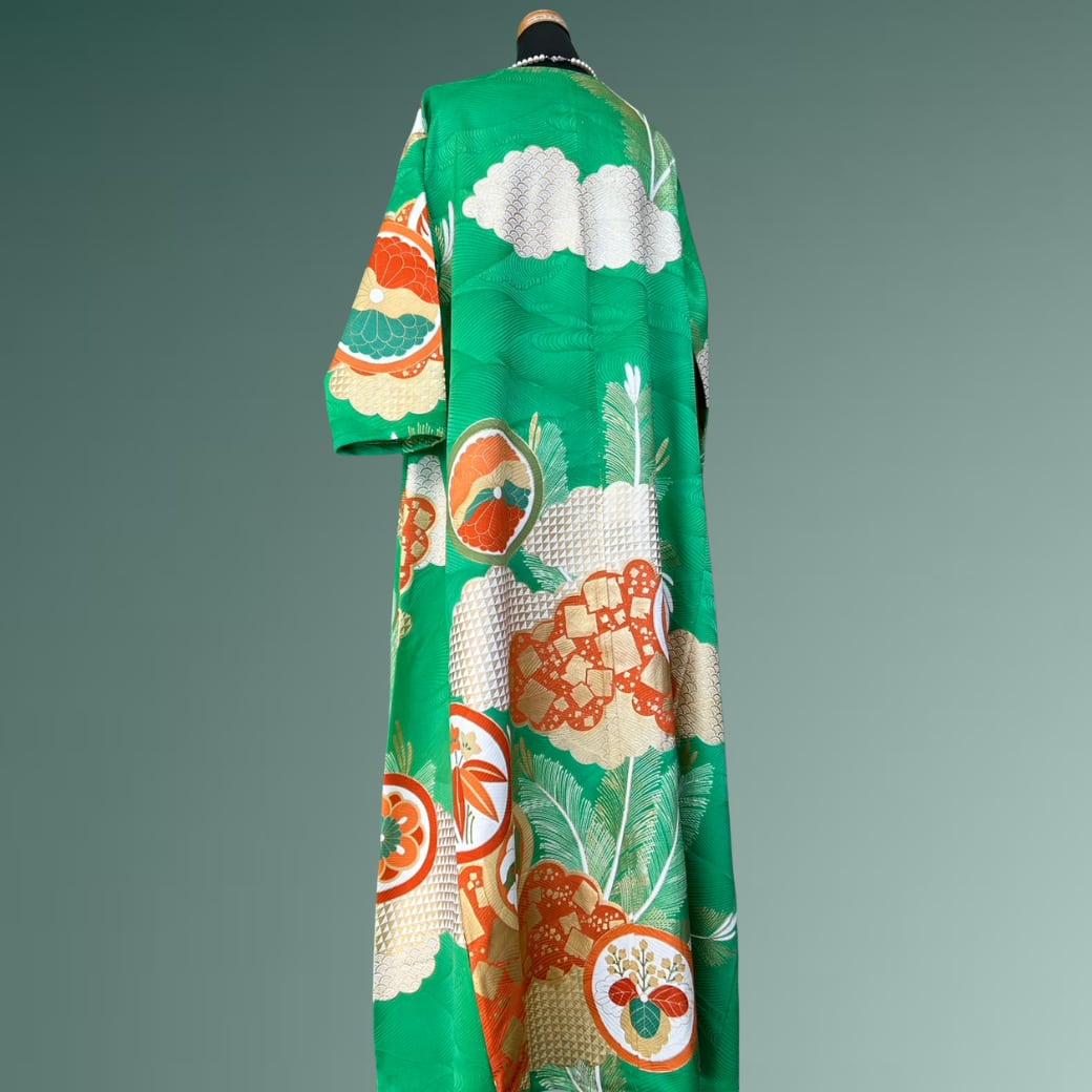 鮮やかな翡翠色に、雲のように柔らかく広がる雲取りが映える、振袖から生まれた着物ワンピースです。