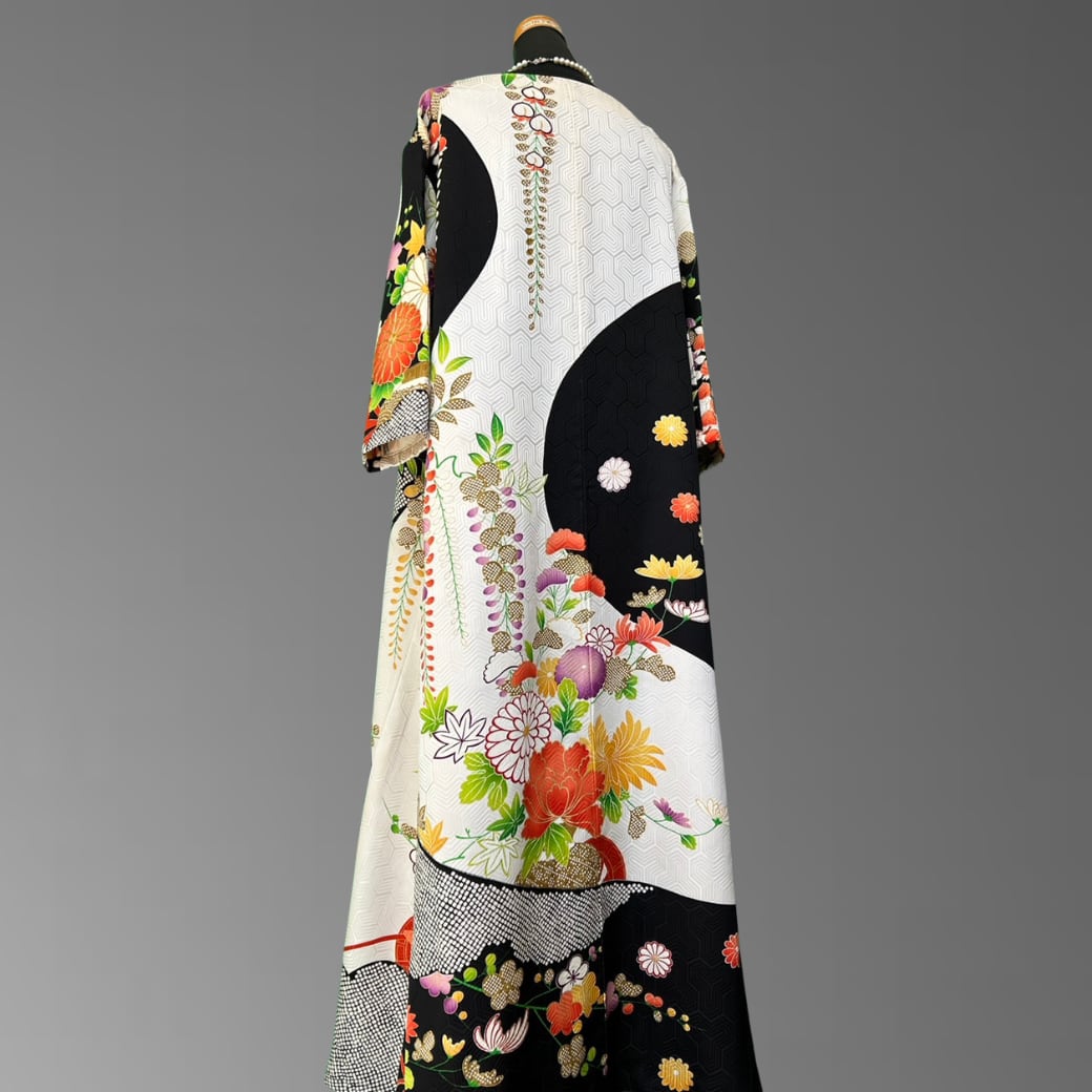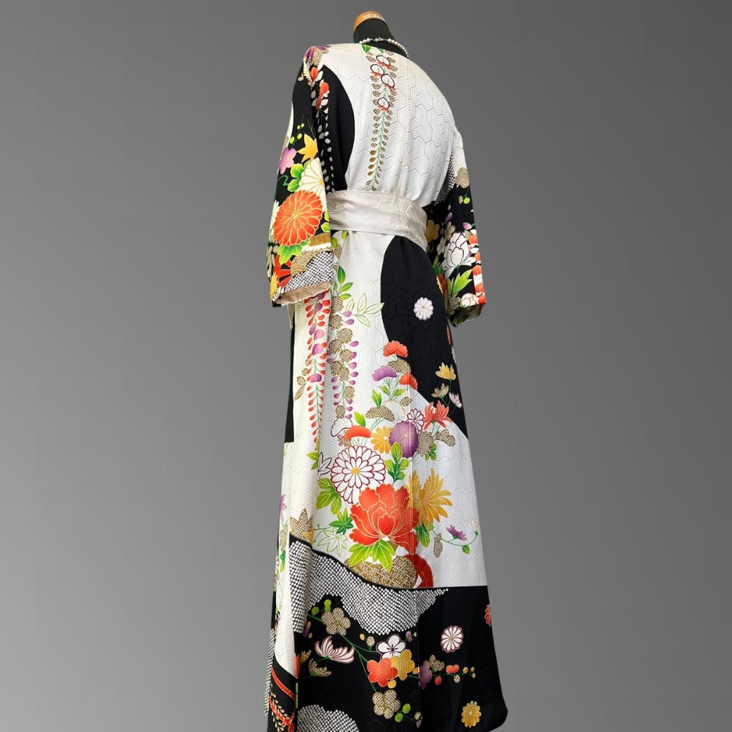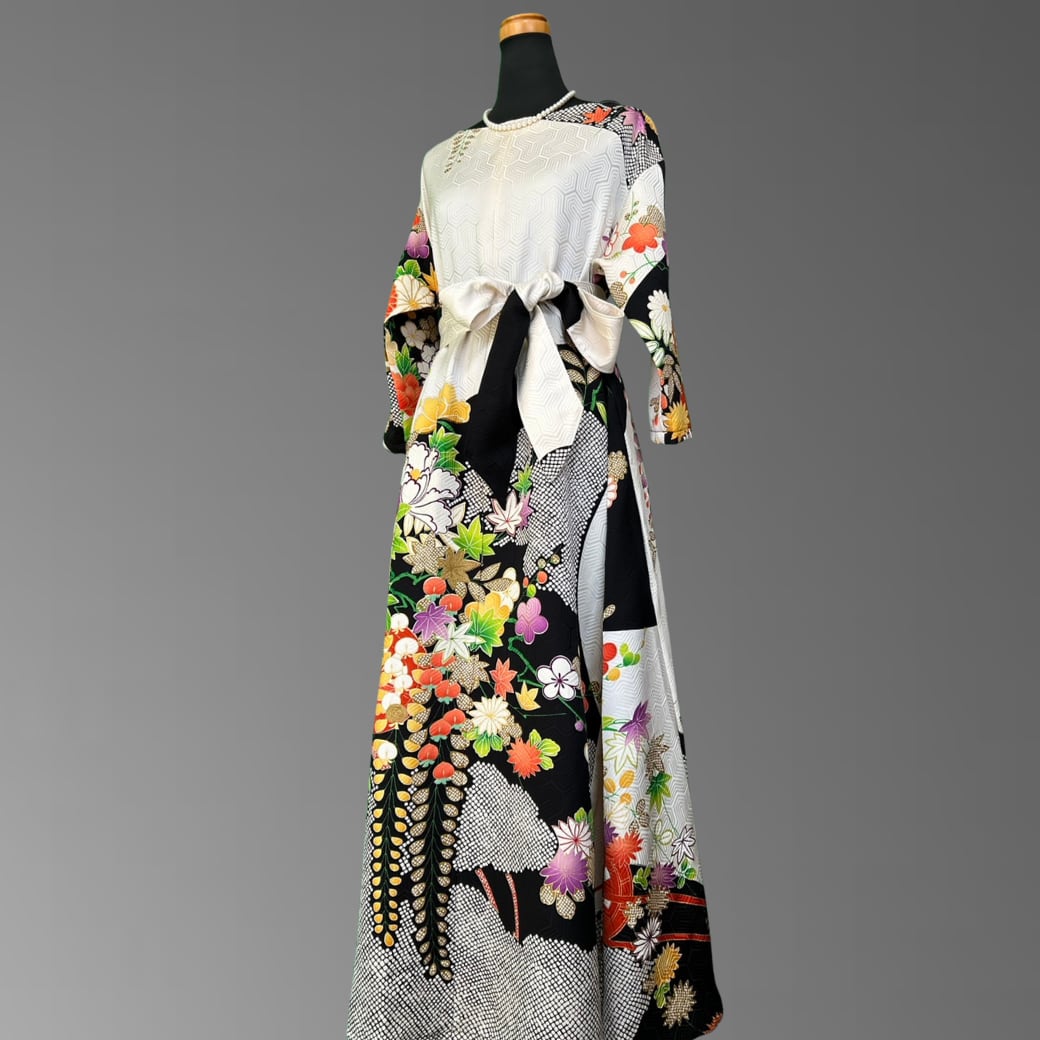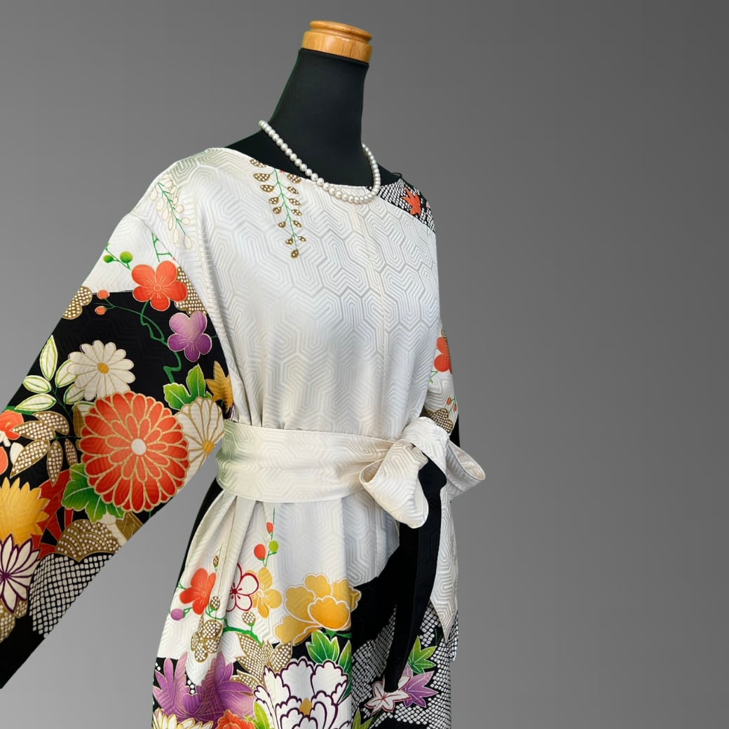 振袖特有の美しさをそのままに、ワンピースとして日常に取り入れやすい上品なシルエットへ。動くたびに花々と金糸がさりげなく揺れ、格式とモダンが溶け合った独特の存在感を放ちます。