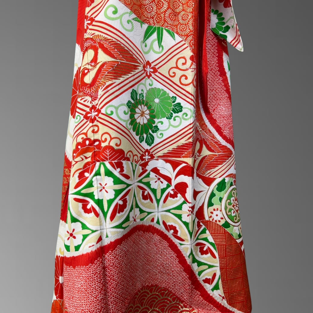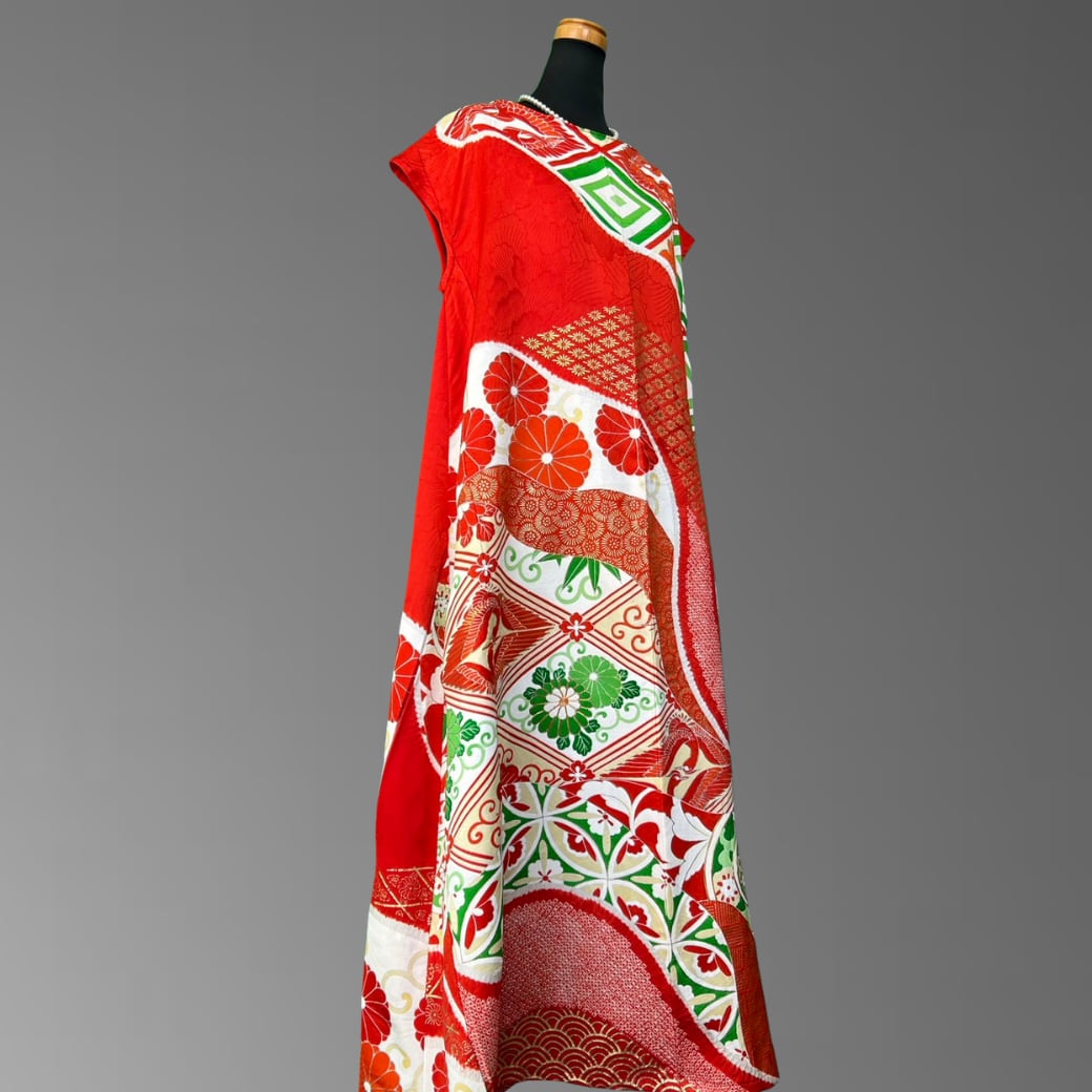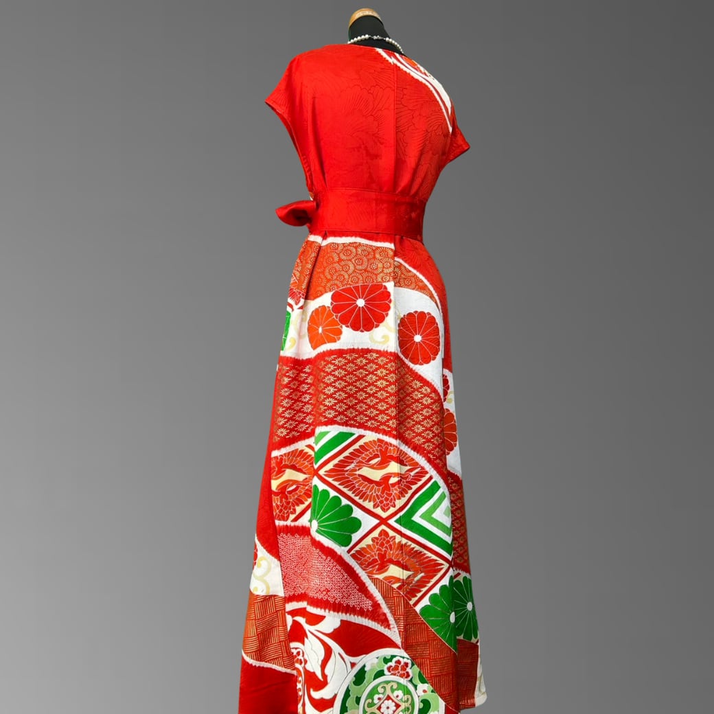 鮮やかな紅と白を基調に、吉祥文様をふんだんに織り込んだ振袖から仕立てた、ボレロ付きの