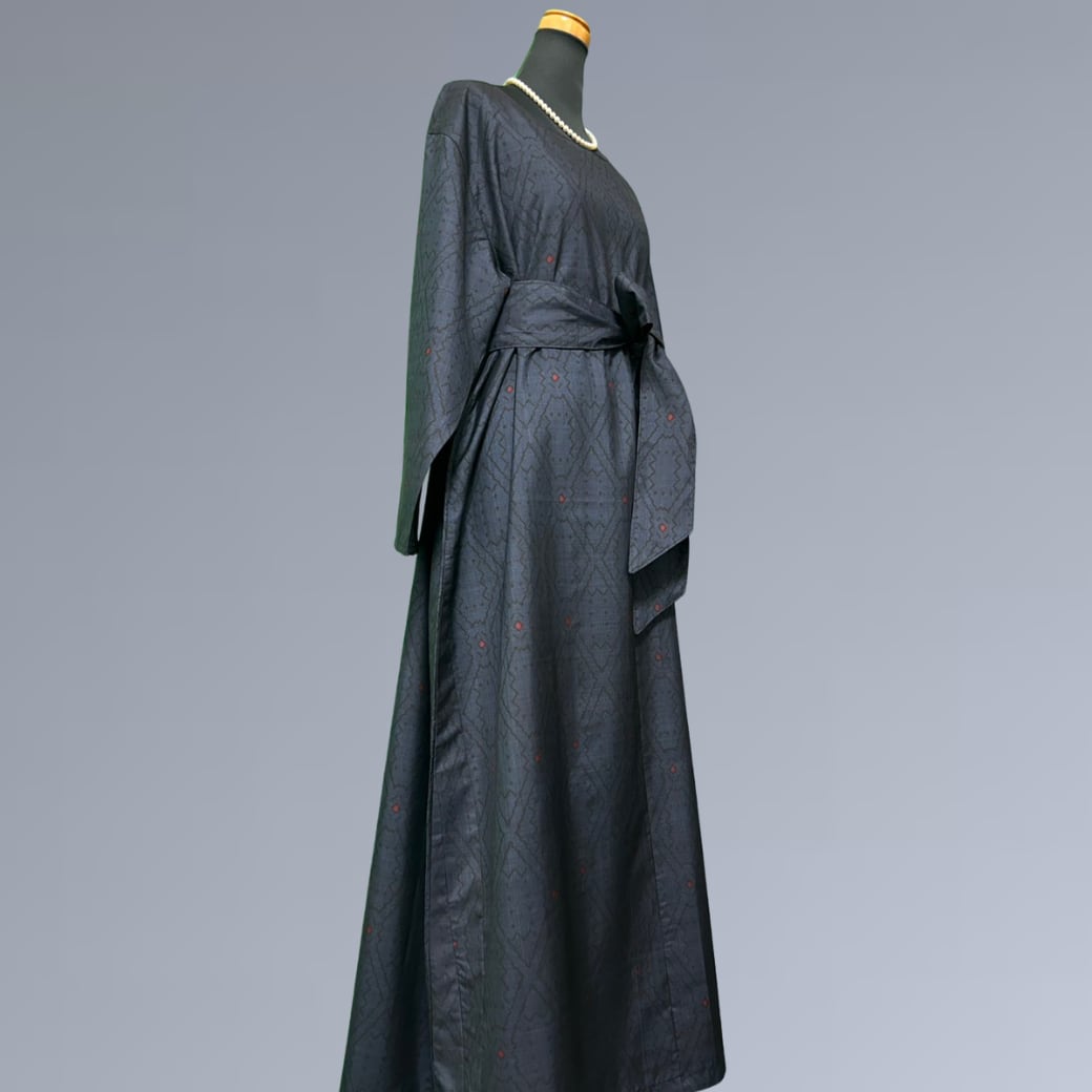 こちらの着物ワンピースは、大島紬ならではの緻密な織りと、洗練された文様美をそのまま生かし、現代の装いとして美しく纏える一着に仕立てました。