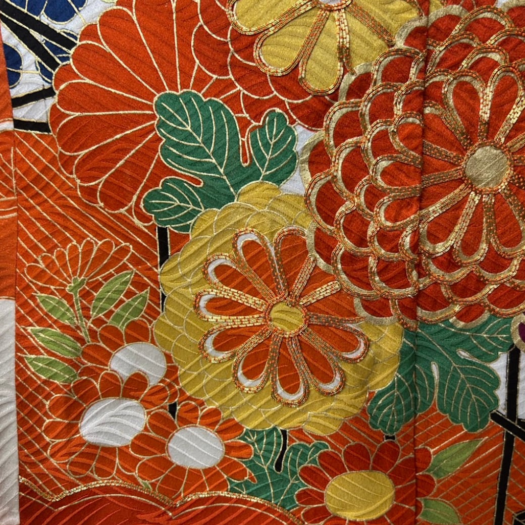 目を引くのは、鮮やかな橙色を基調とした地色に、金糸を用いて描かれた文様の奥行き。