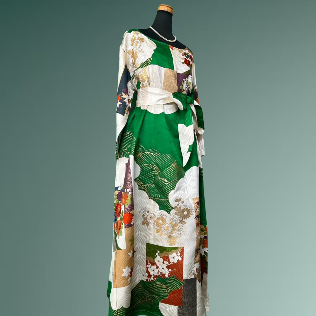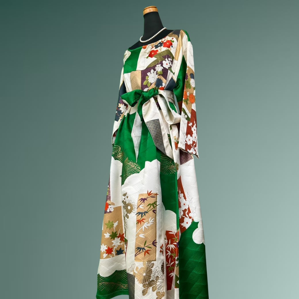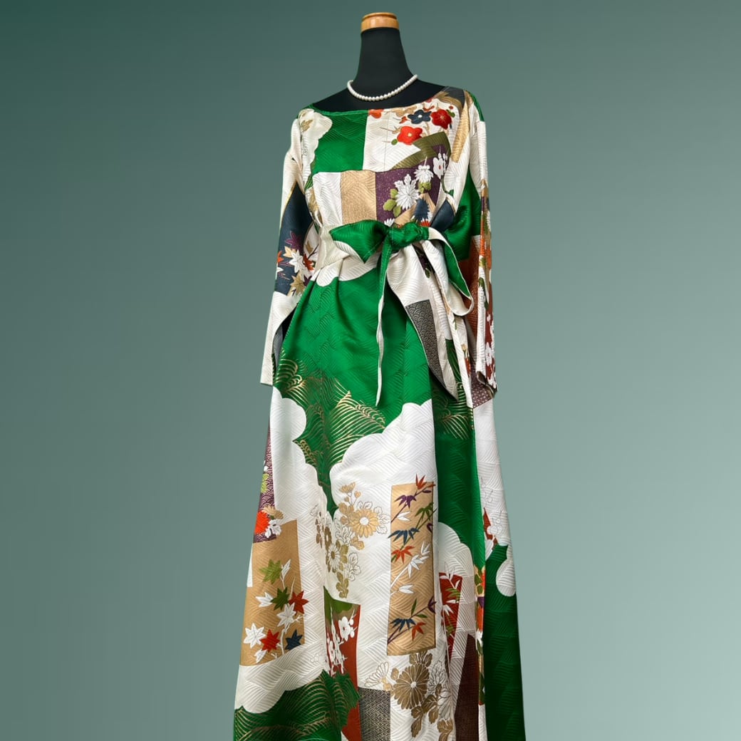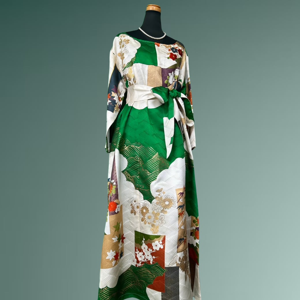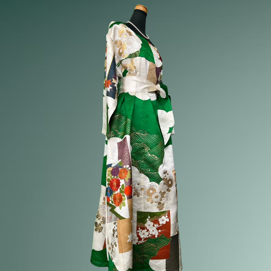 こちらの着物ワンピースは、晴れやかな振袖をもとに仕立てた一着です。