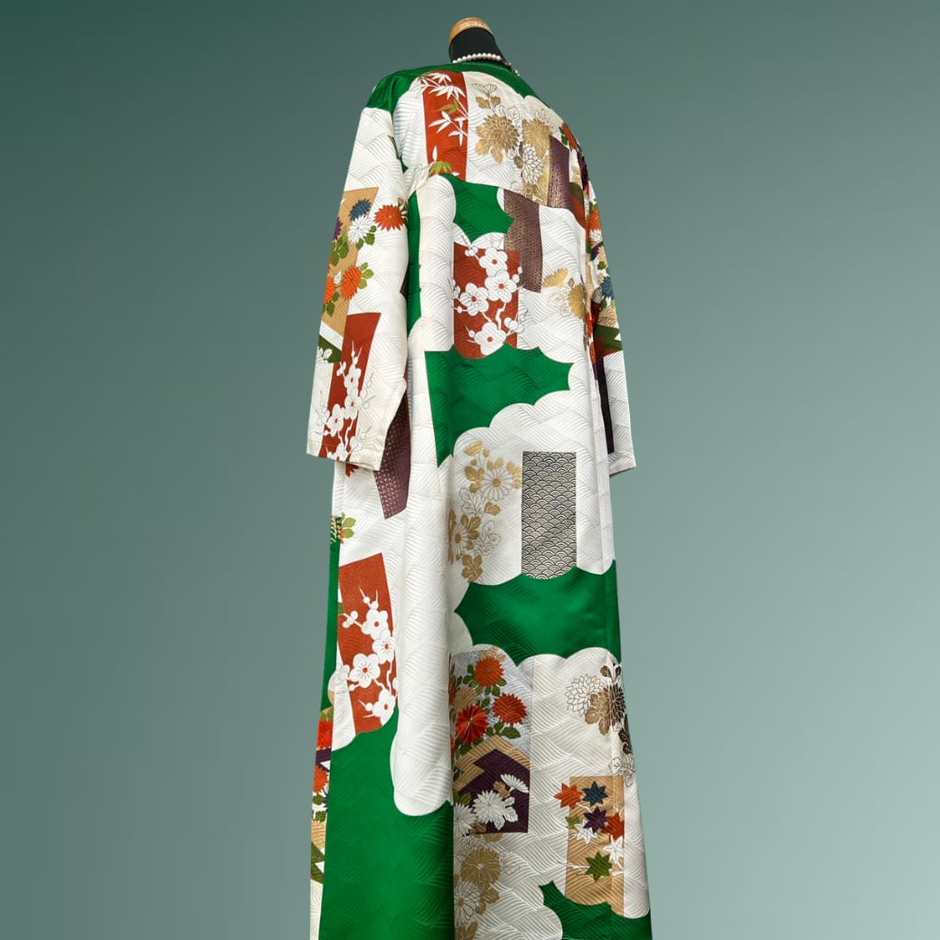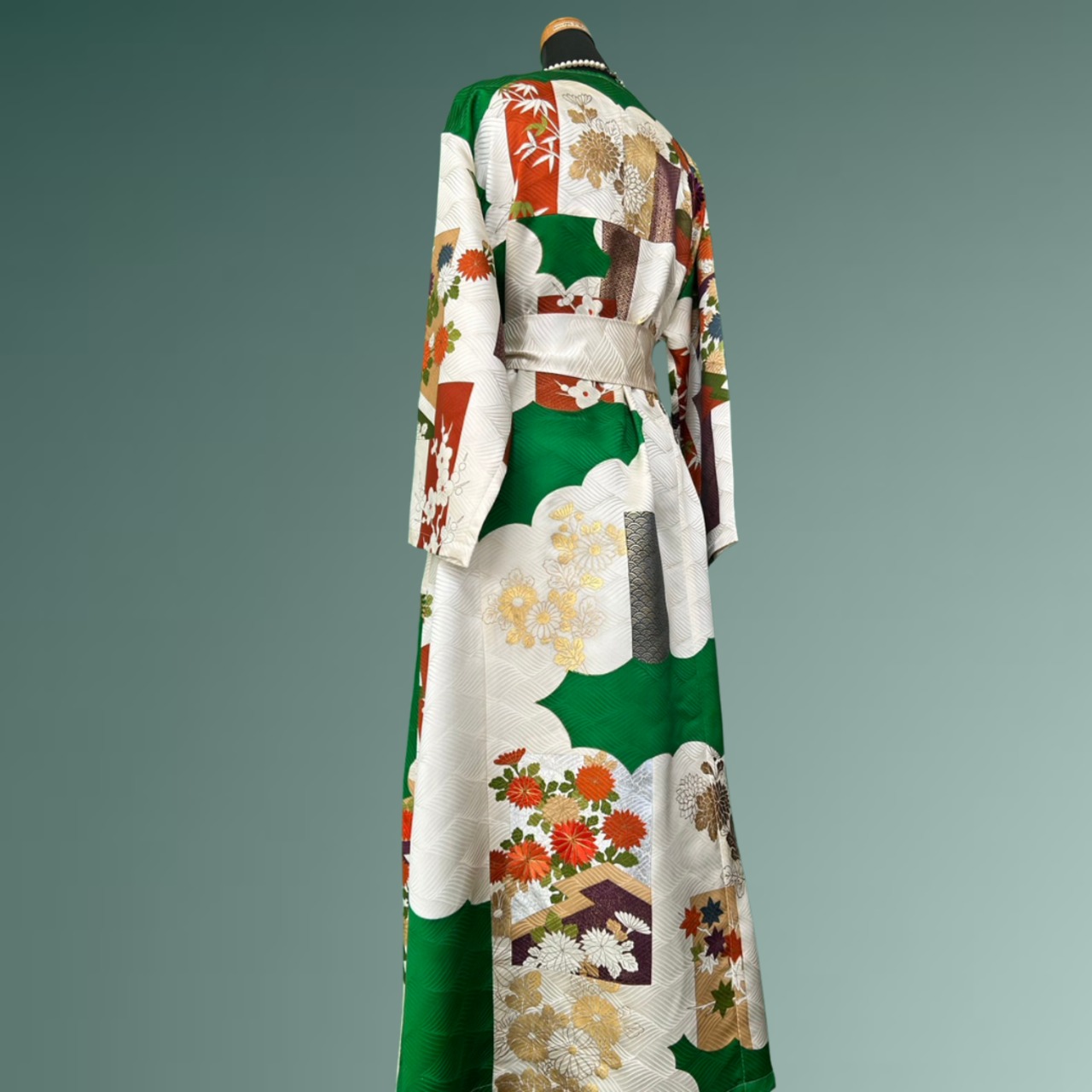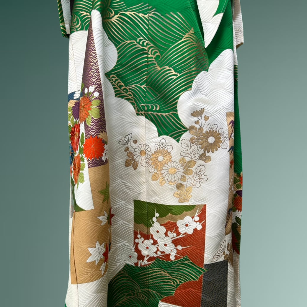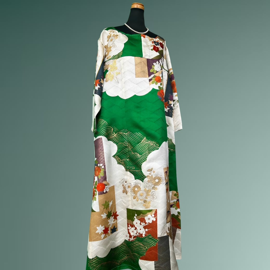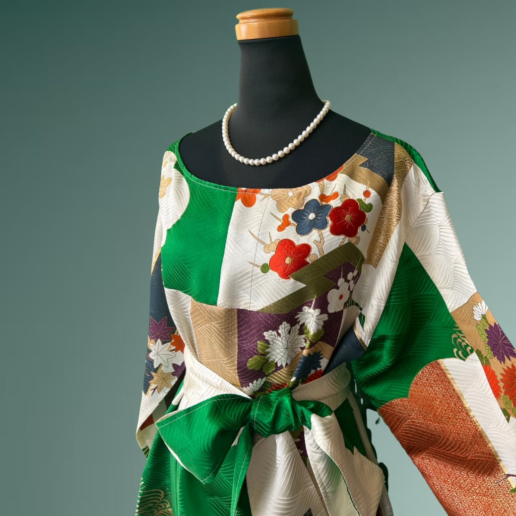 こちらの着物ワンピースは、晴れやかな振袖をもとに仕立てた一着です。