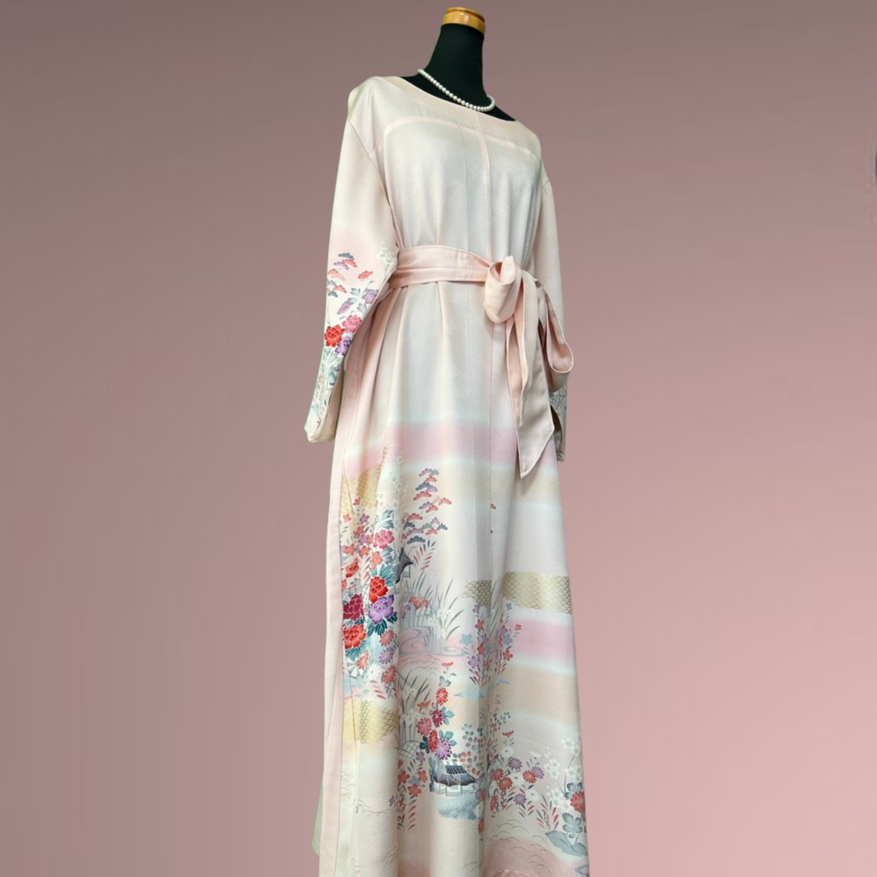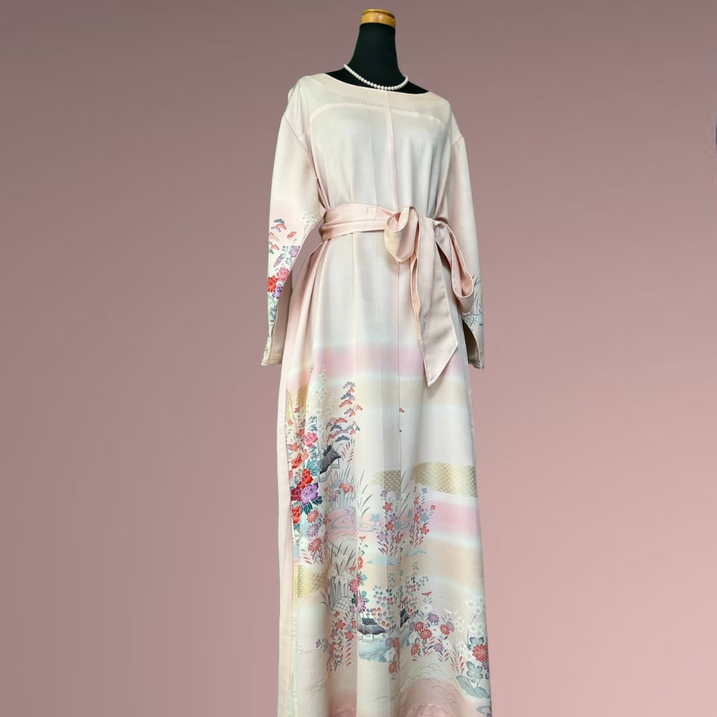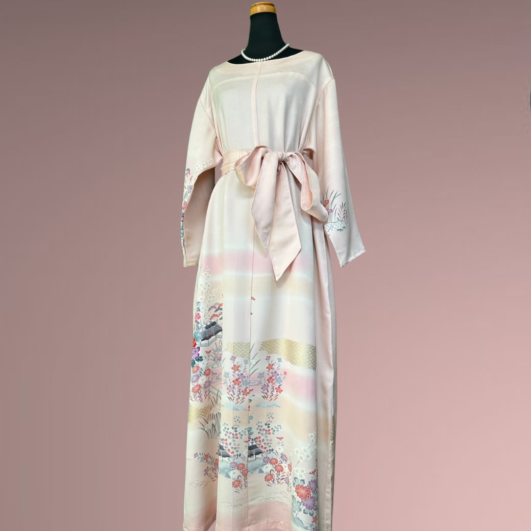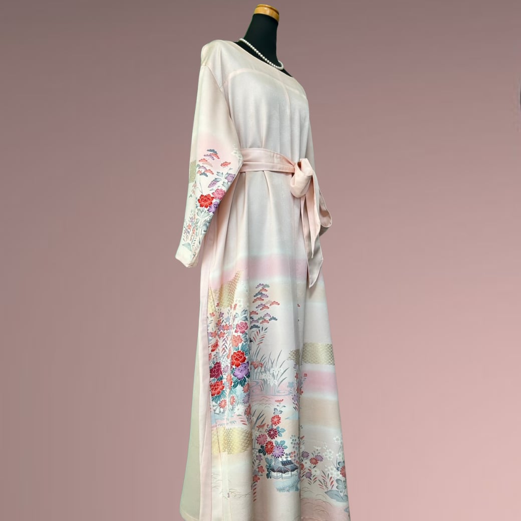 こちらの着物ワンピースは、やわらかな色調の訪問着をもとに仕立てた一着です。