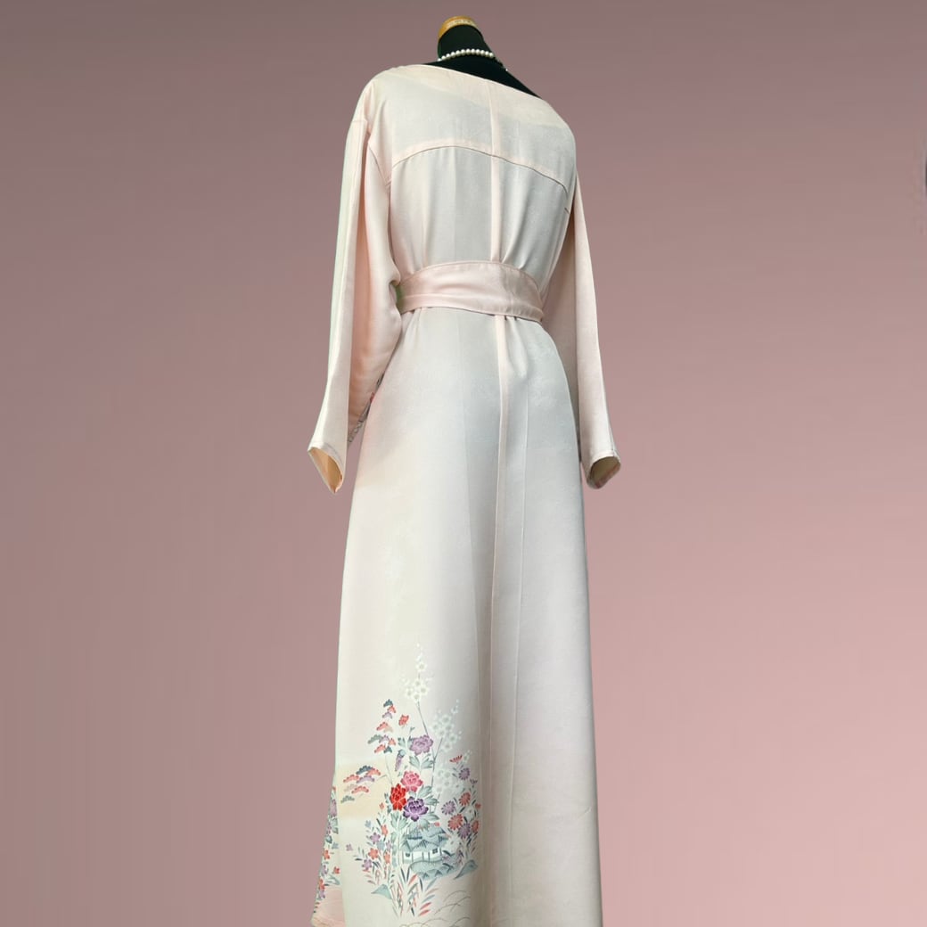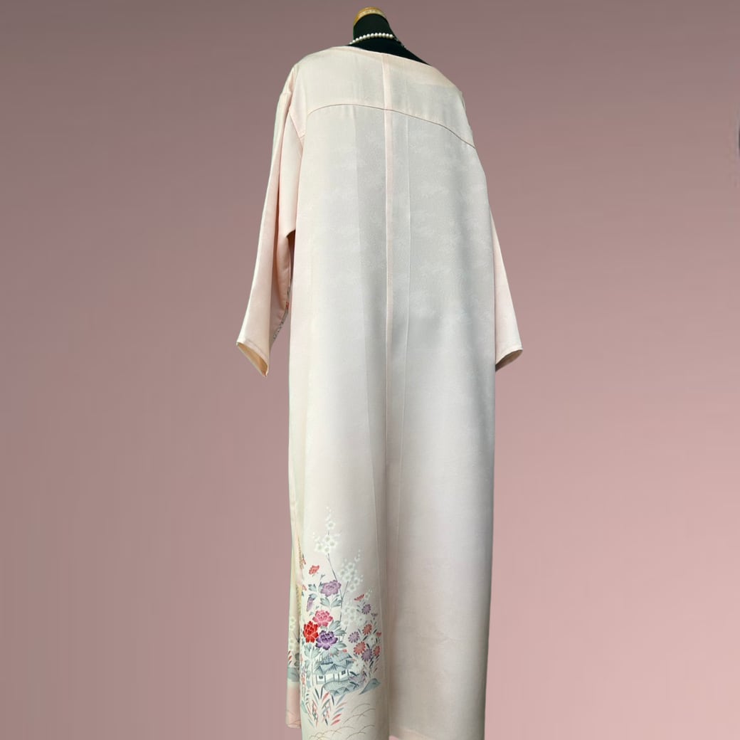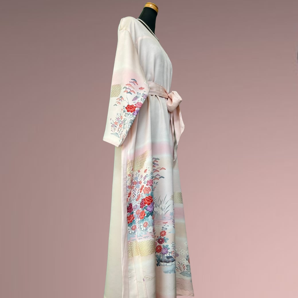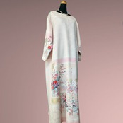 こちらの着物ワンピースは、やわらかな色調の訪問着をもとに仕立てた一着です。