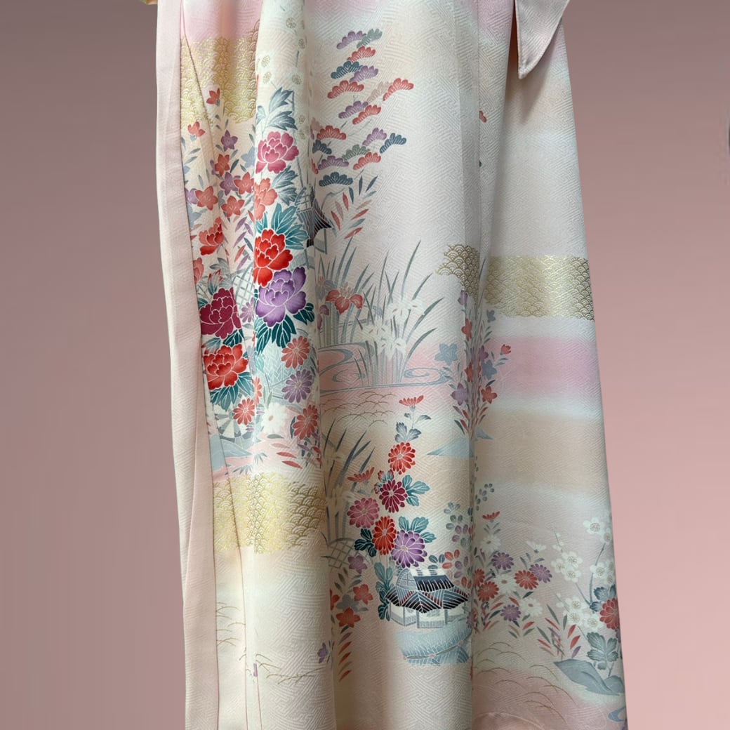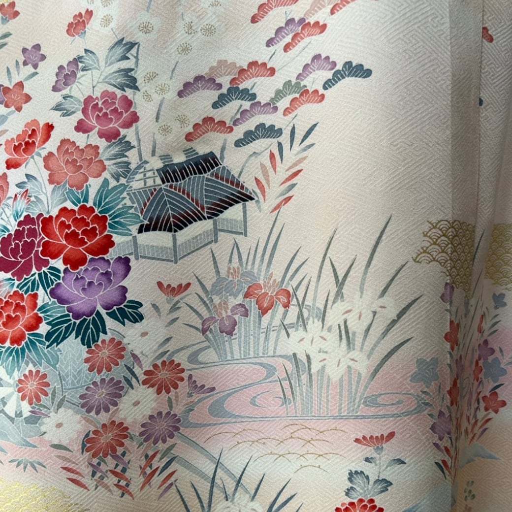 淡い桜色から乳白色へと移ろう地色に、静かに咲き誇るあやめ、牡丹、菊の意匠が描かれ、全体に穏やかな時間の流れを感じさせます。