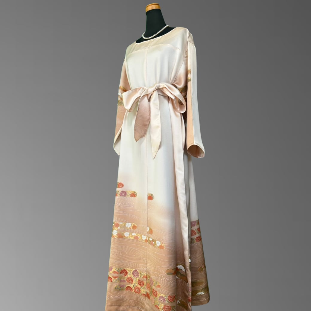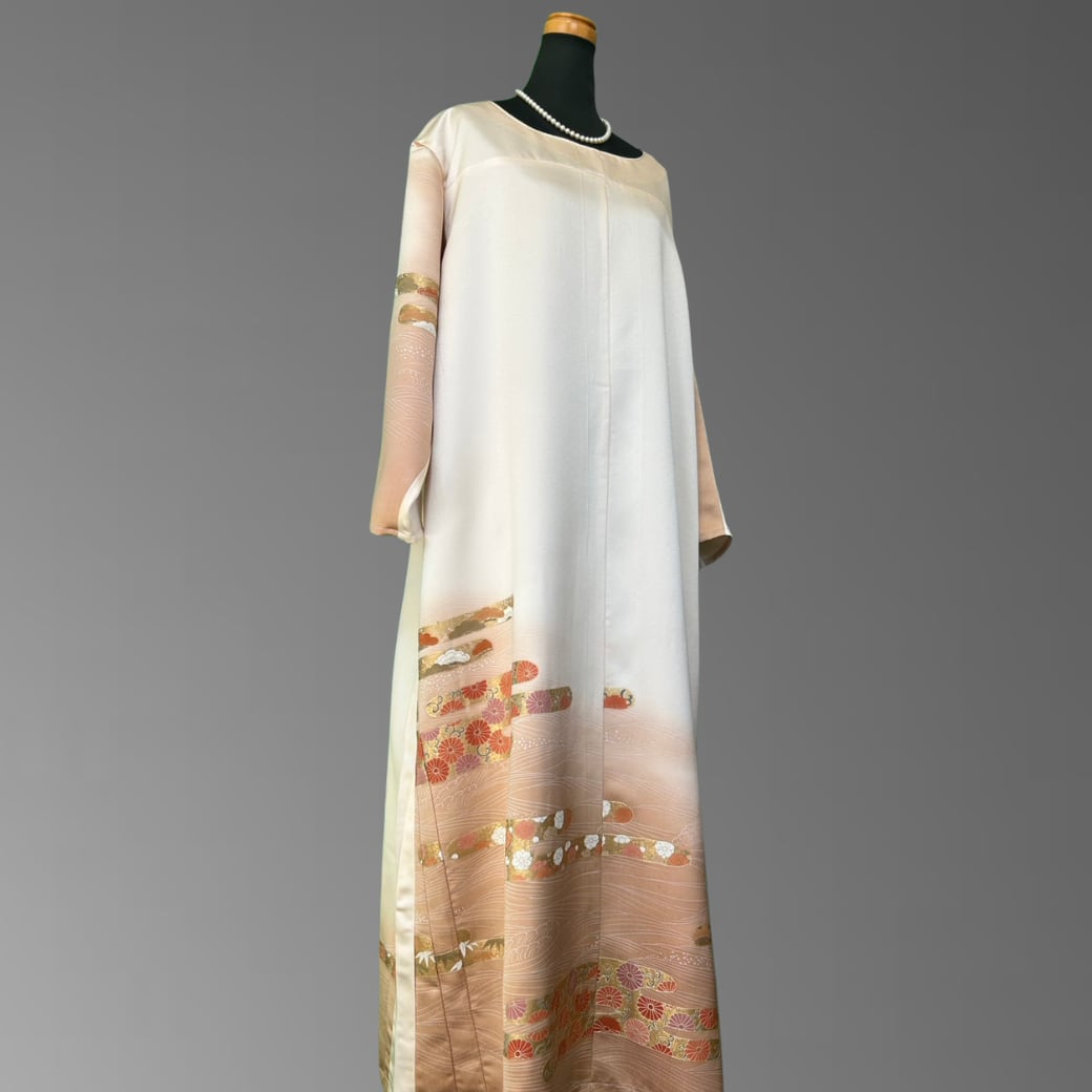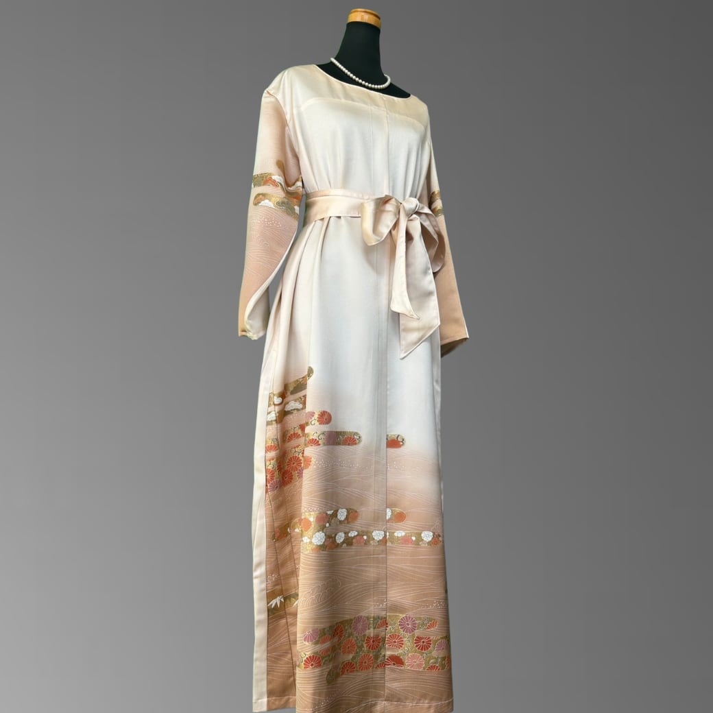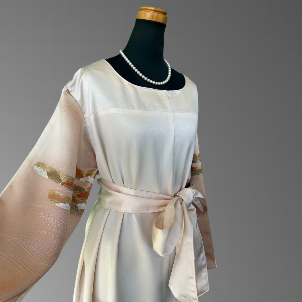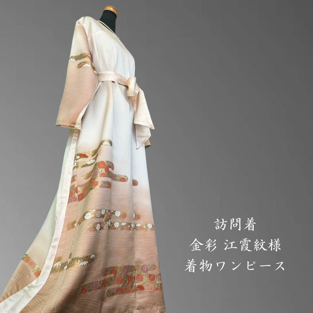 こちらの着物ワンピースは、やわらかな光を含んだ訪問着をもとに仕立てた一着です。