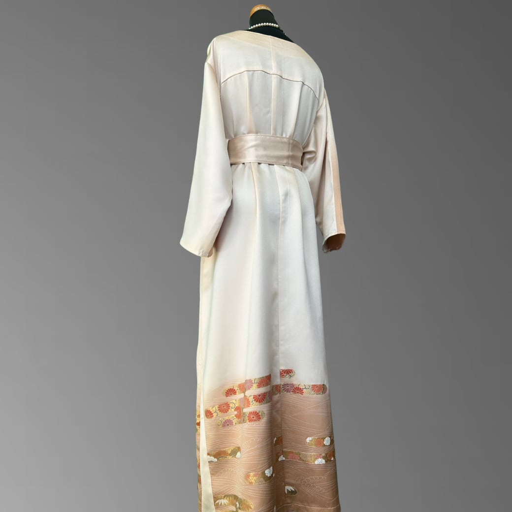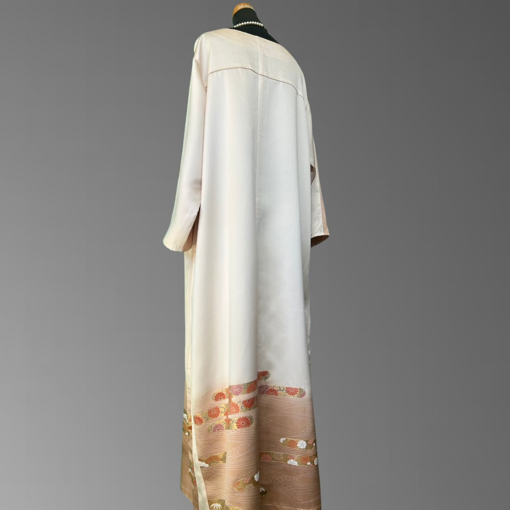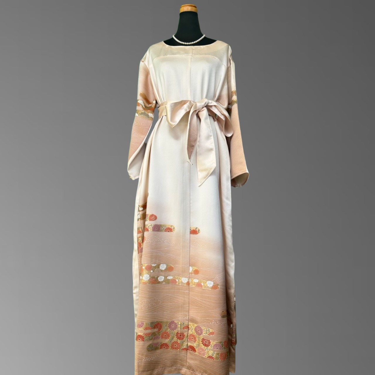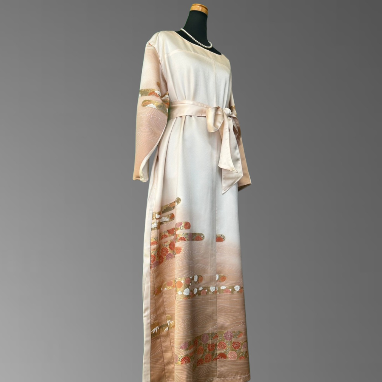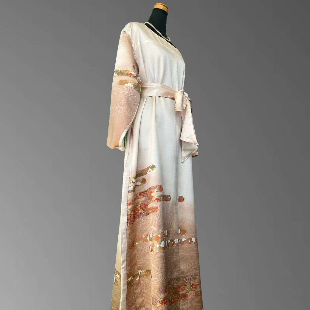 こちらの着物ワンピースは、やわらかな光を含んだ訪問着をもとに仕立てた一着です。