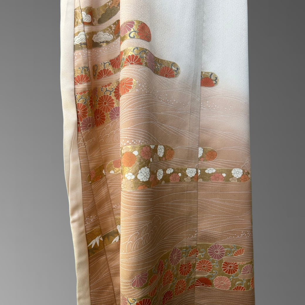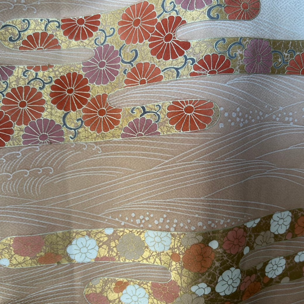 淡い生成りからやさしい桃色へと移ろう地色の上に、金彩で描かれた江霞紋様が、静かに流れる景色のように広がります。