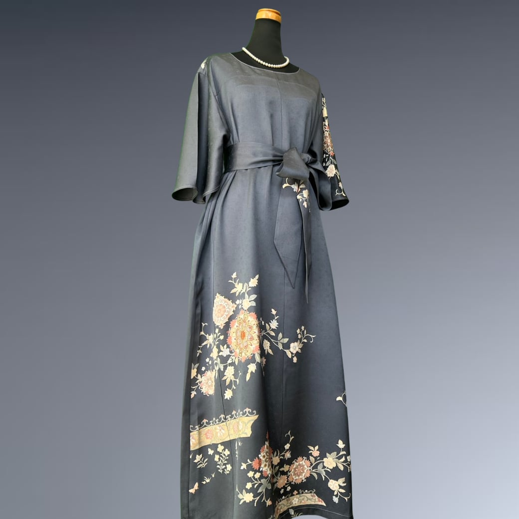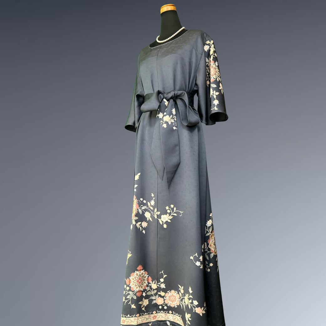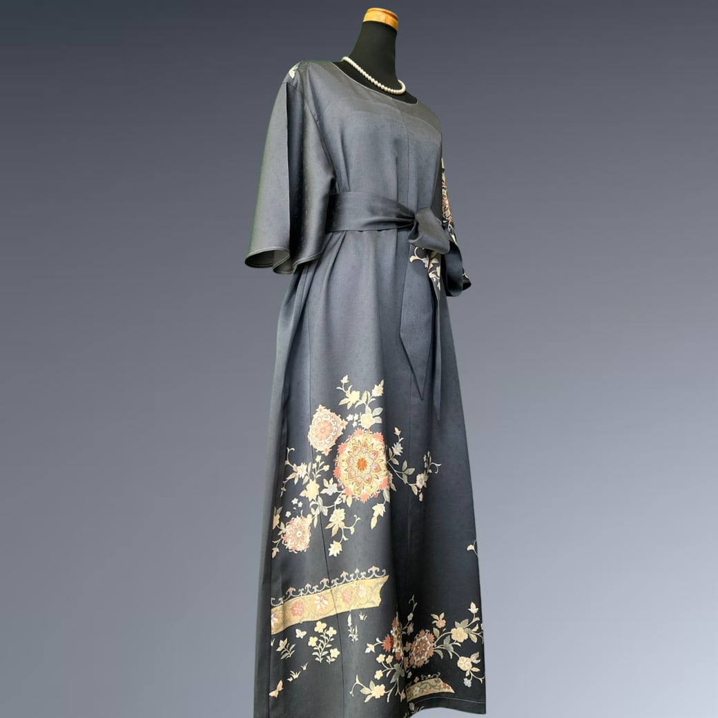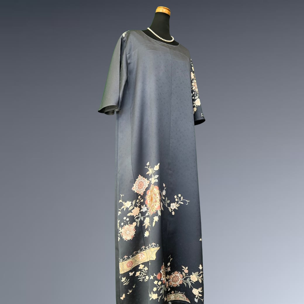 こちらの着物ワンピースは、深みのある地色に金糸を用いた花意匠が配された訪問着から仕立てた一着です。