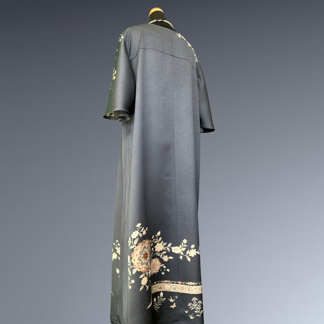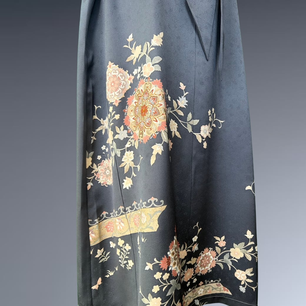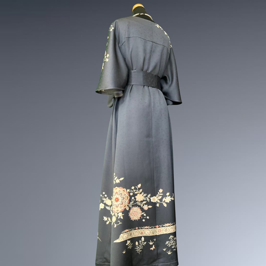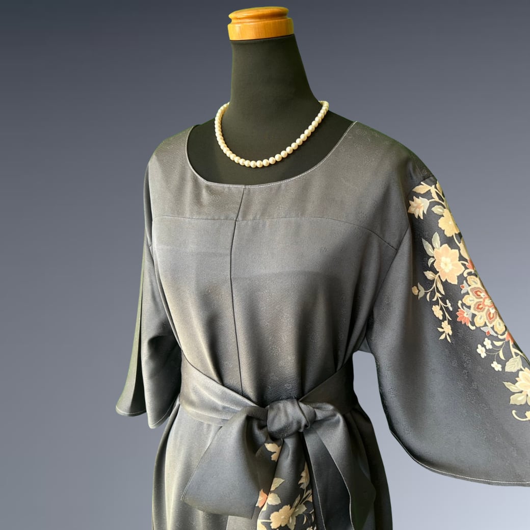 こちらの着物ワンピースは、深みのある地色に金糸を用いた花意匠が配された訪問着から仕立てた一着です。