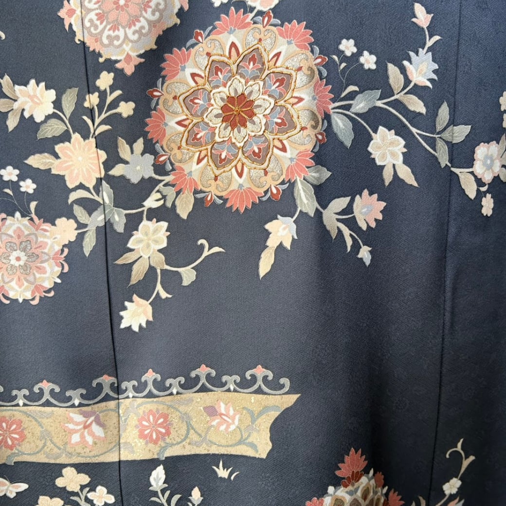 流れるように配置された文様は、視線を自然に下へ導き、装い全体に品のあるリズムを生み出します。