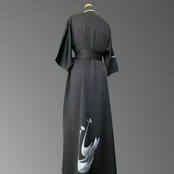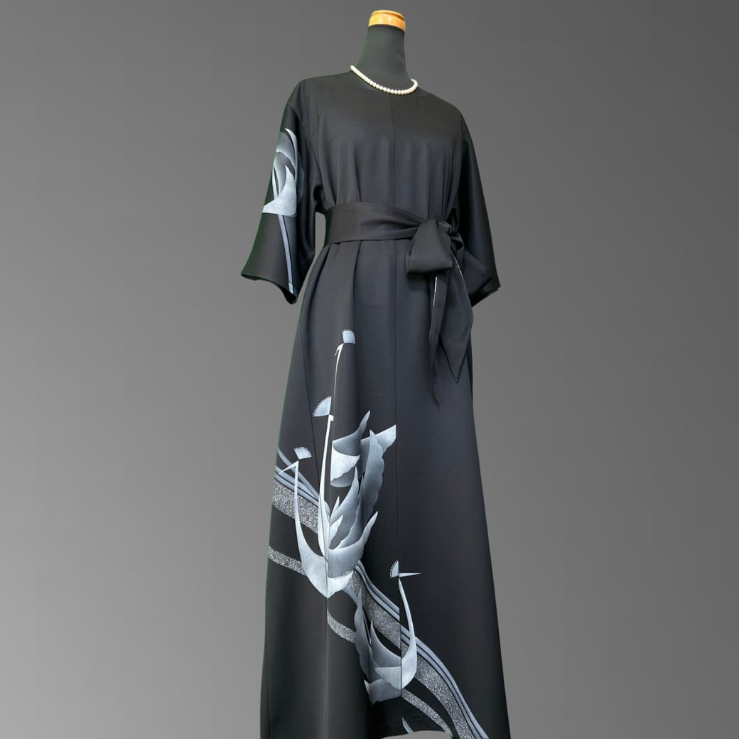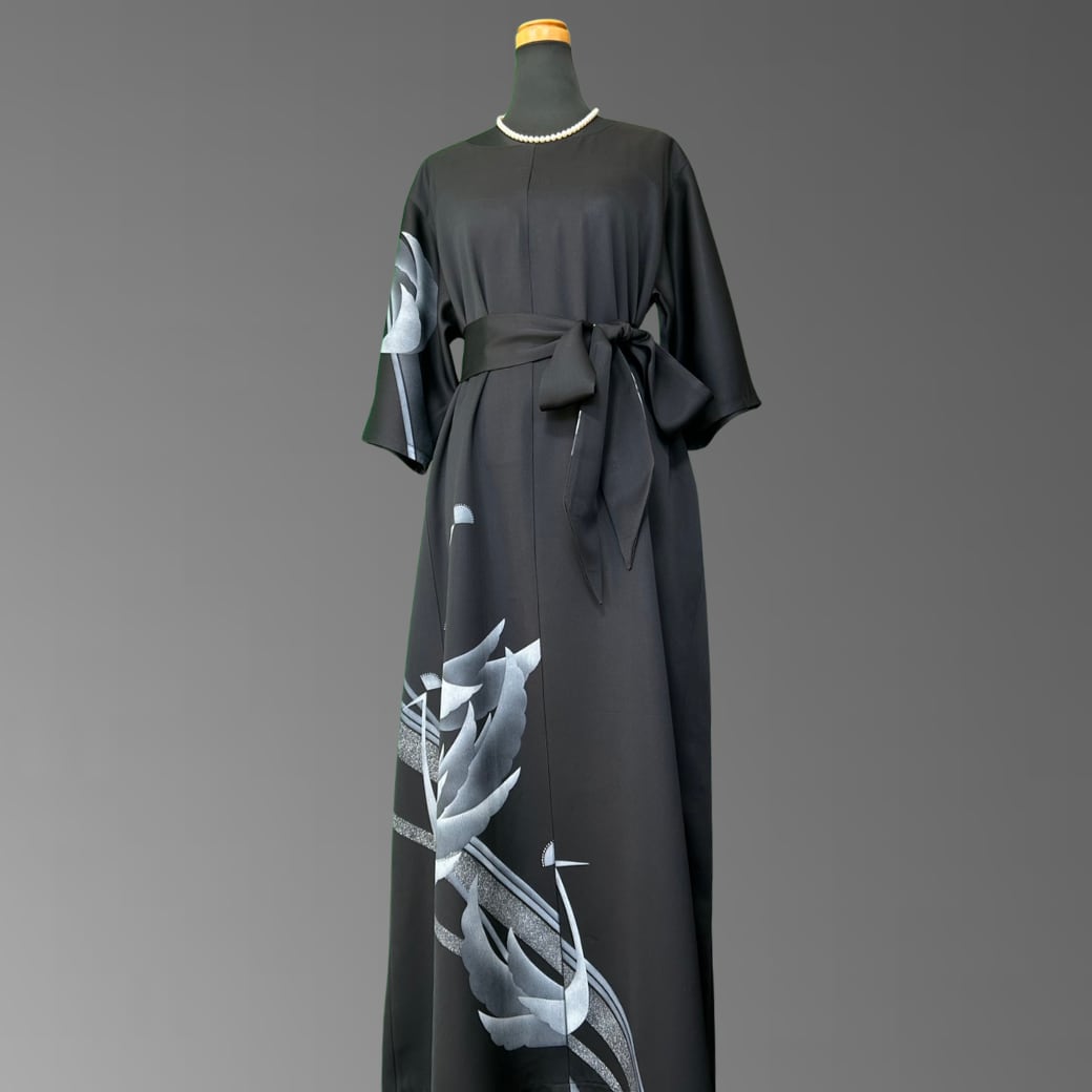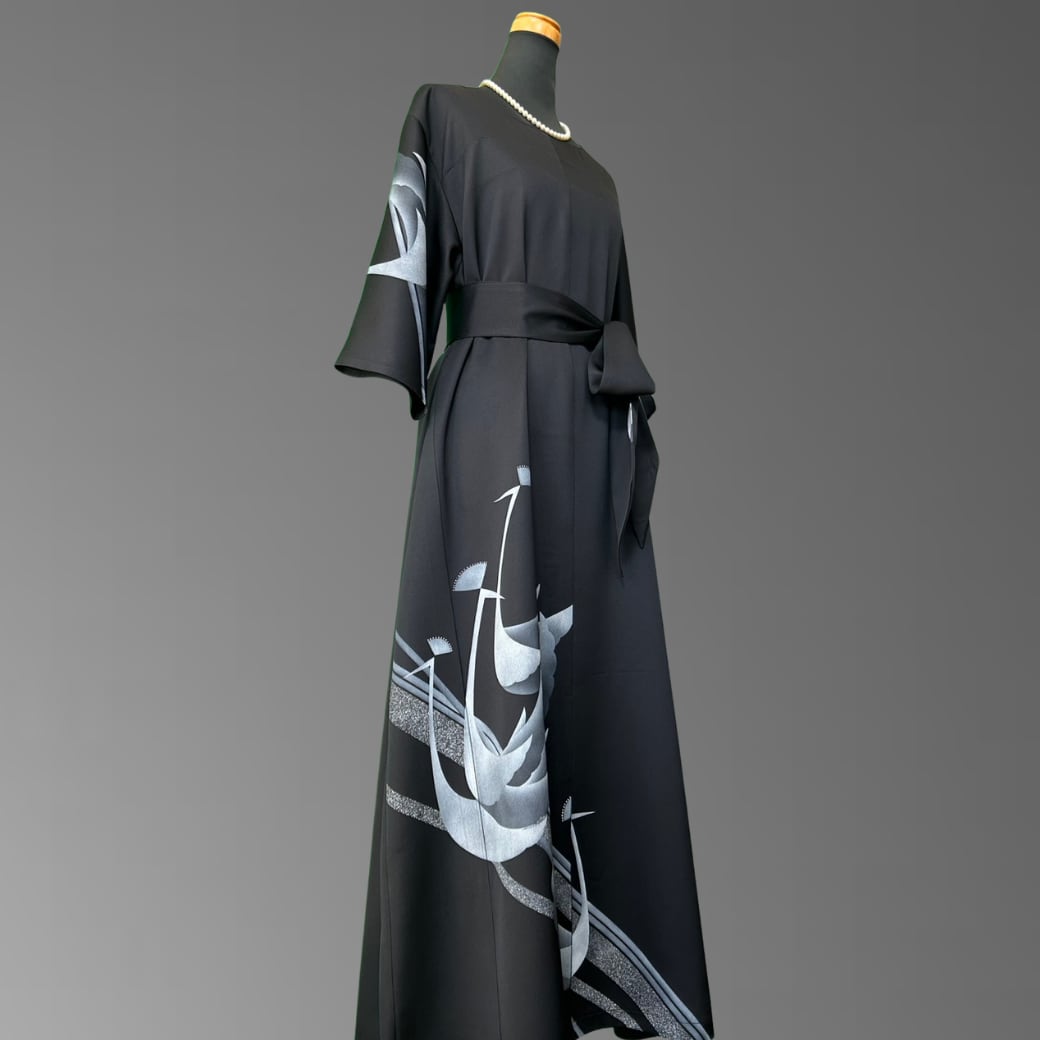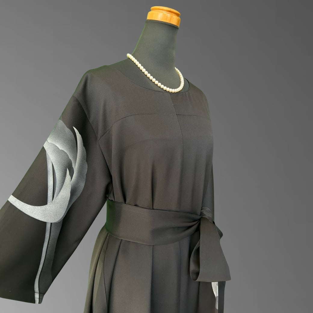 こちらの着物ワンピースは、深みのある漆黒の地に、静かに浮かび上がる孔雀の意匠が描かれた訪問着から仕立てた一着です。