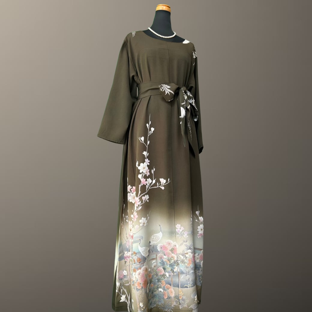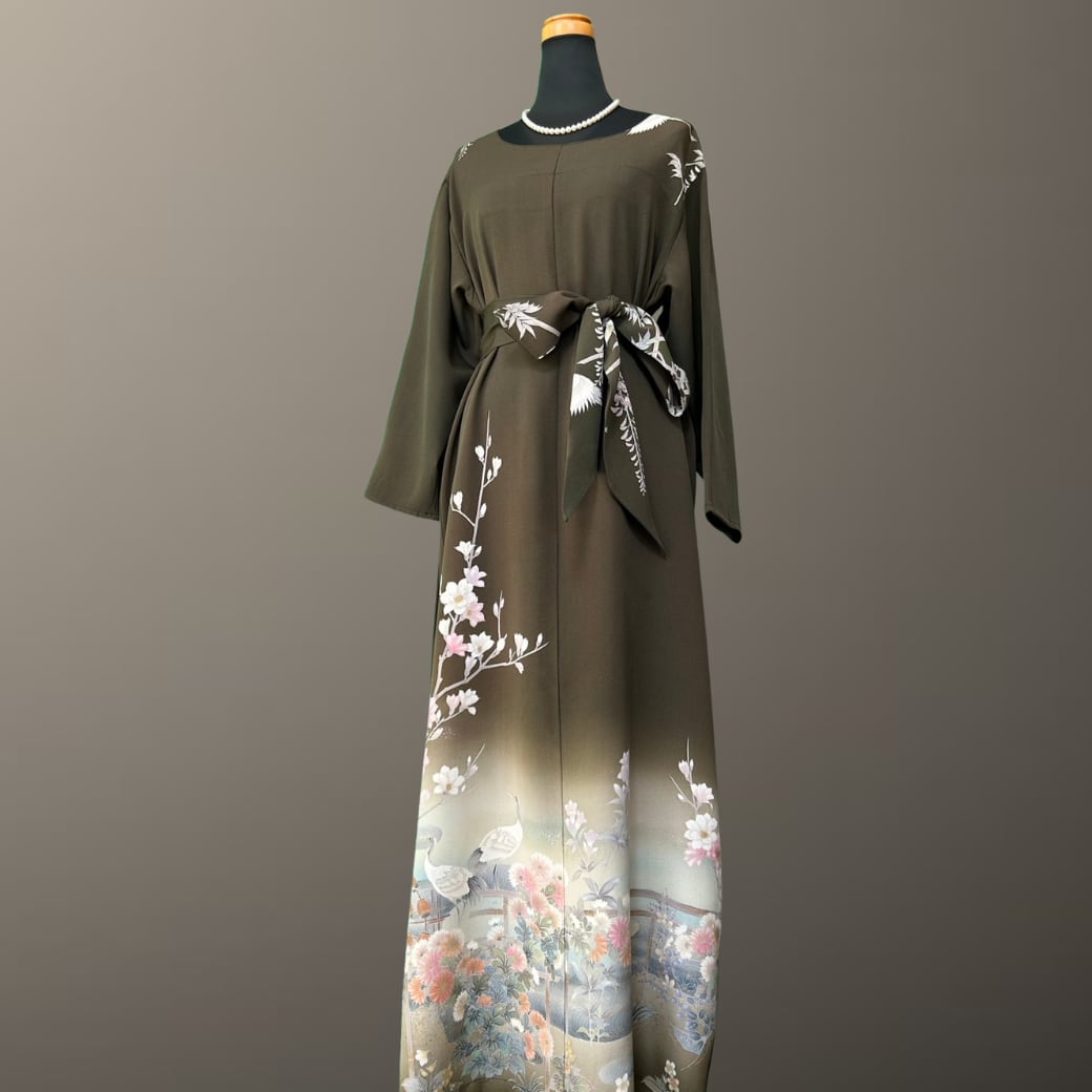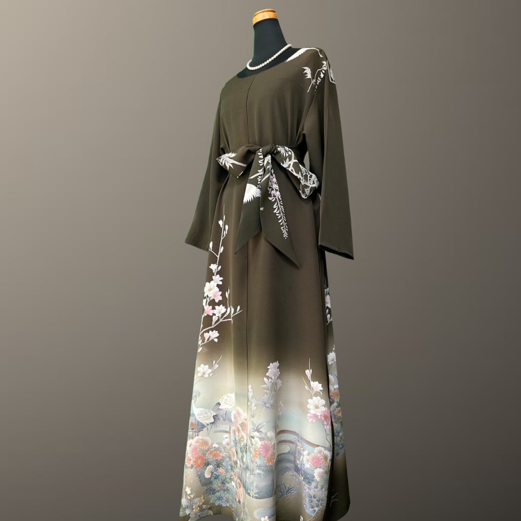 こちらの着物ワンピースは、深みのある落ち着いた地色に、静かな物語を感じさせる訪問着から仕立てた一着です。