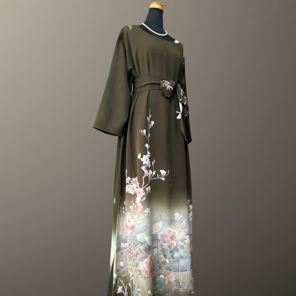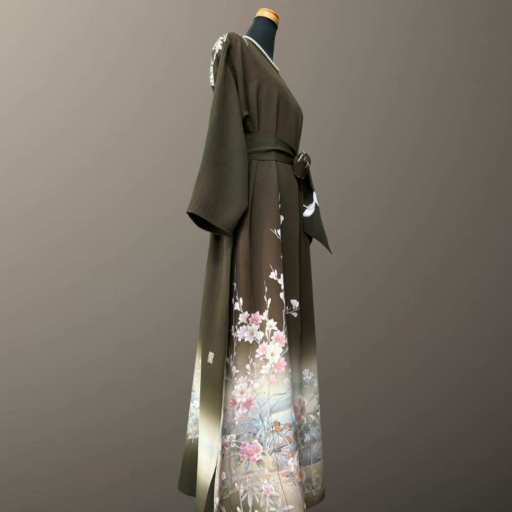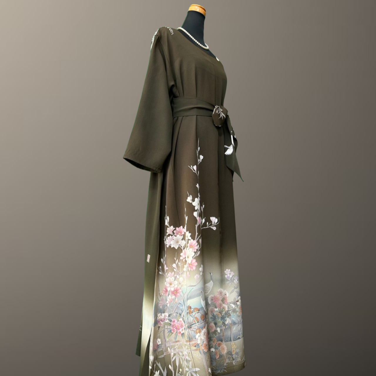 こちらの着物ワンピースは、深みのある落ち着いた地色に、静かな物語を感じさせる訪問着から仕立てた一着です。