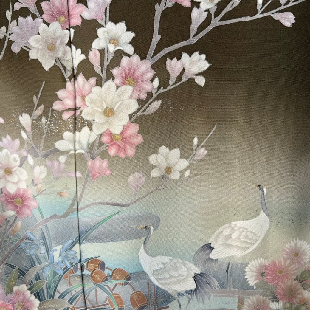 裾に向かって広がる景色の中には、穏やかに佇む鶴、やわらかに咲く花水木、凛とした姿のりんどうが描かれています。