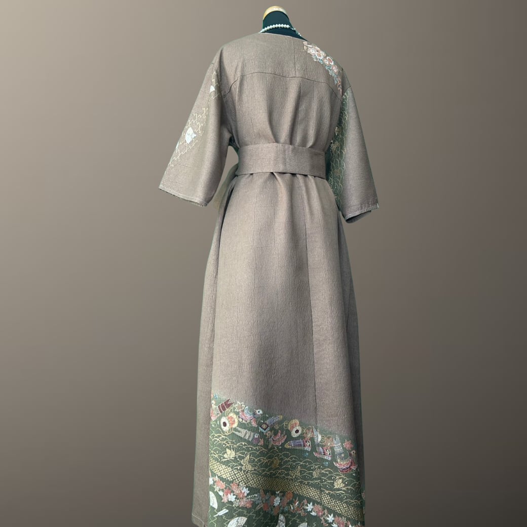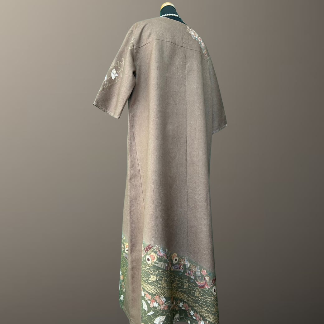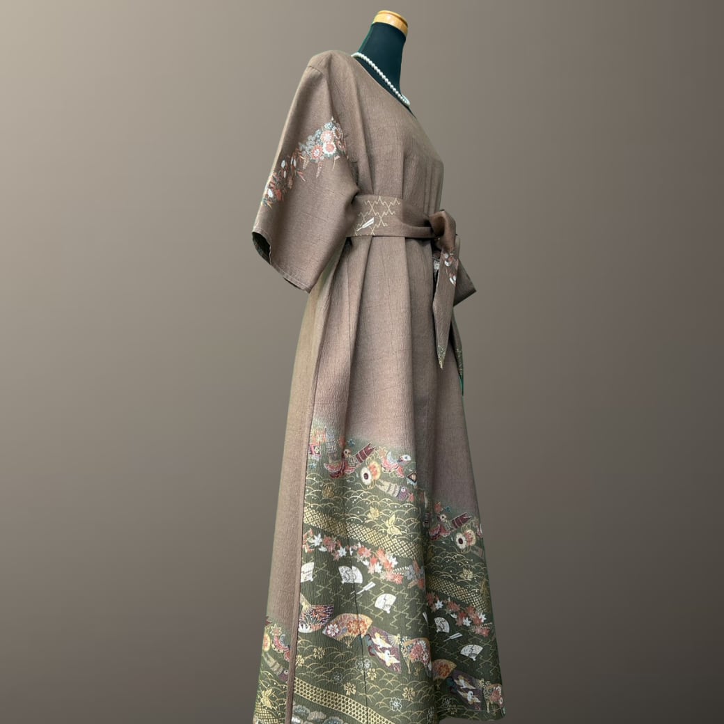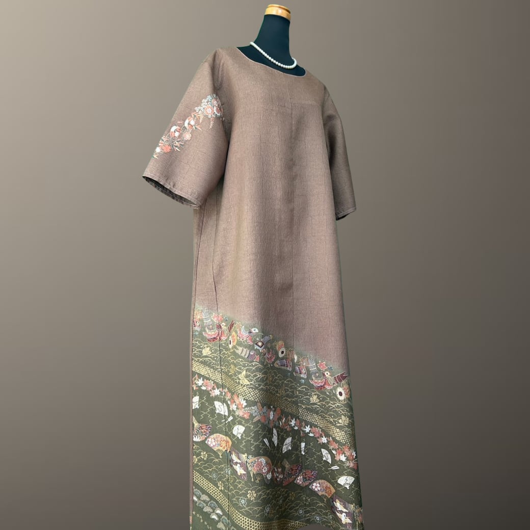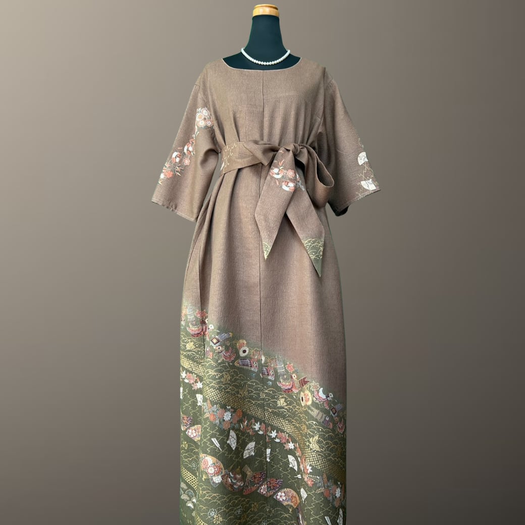 こちらの着物ワンピースは、落ち着いた茶系の訪問着をもとに仕立てた一着です。