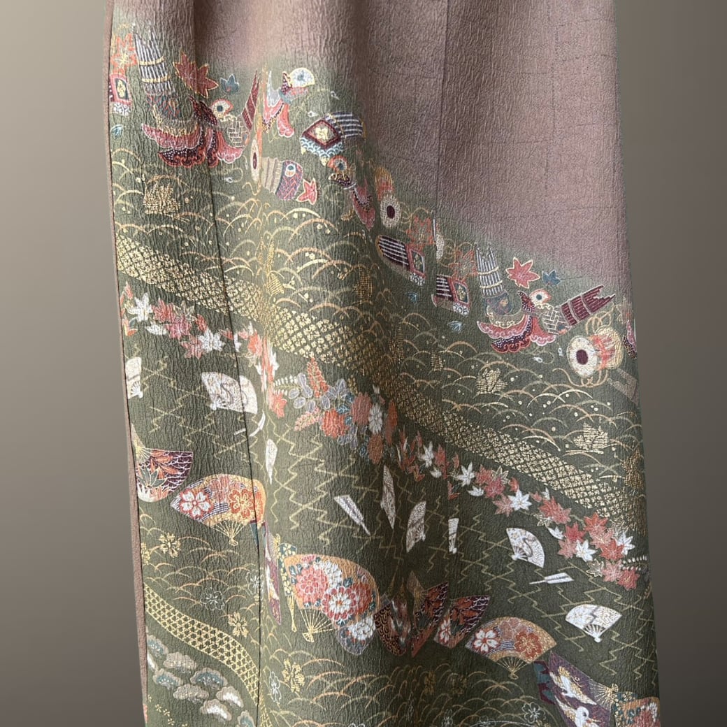 やわらかく深みのある地色に、裾いっぱいに広がる宝尽くしと扇、波の意匠が印象的で、