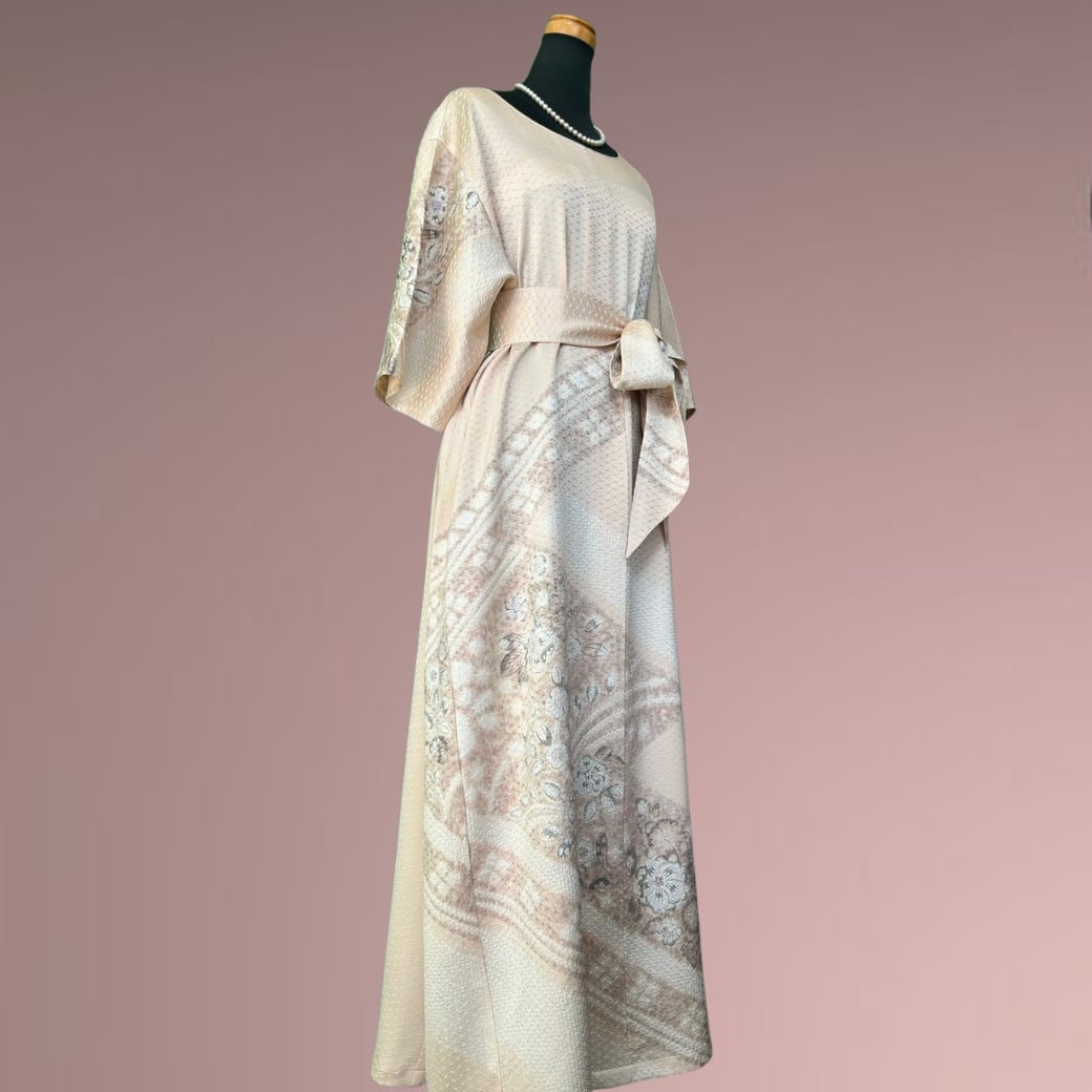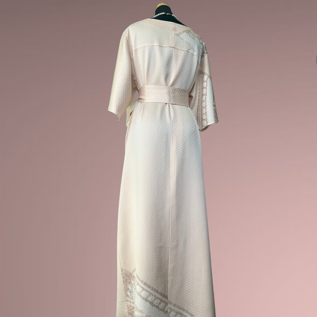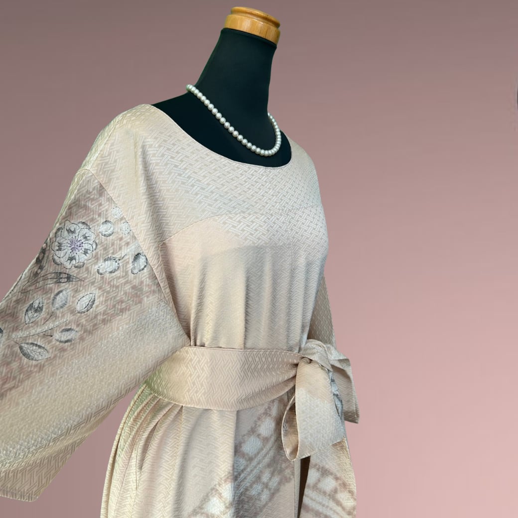 こちらの着物ワンピースは、淡く上品な色留袖をもとに仕立てた一着です。