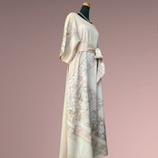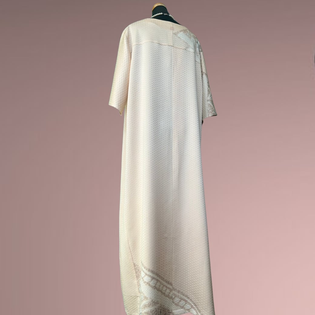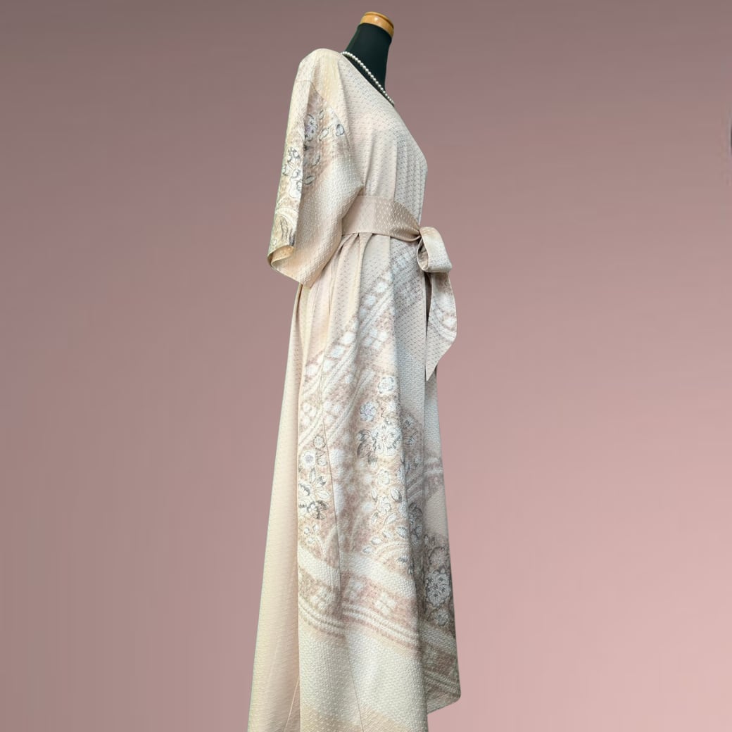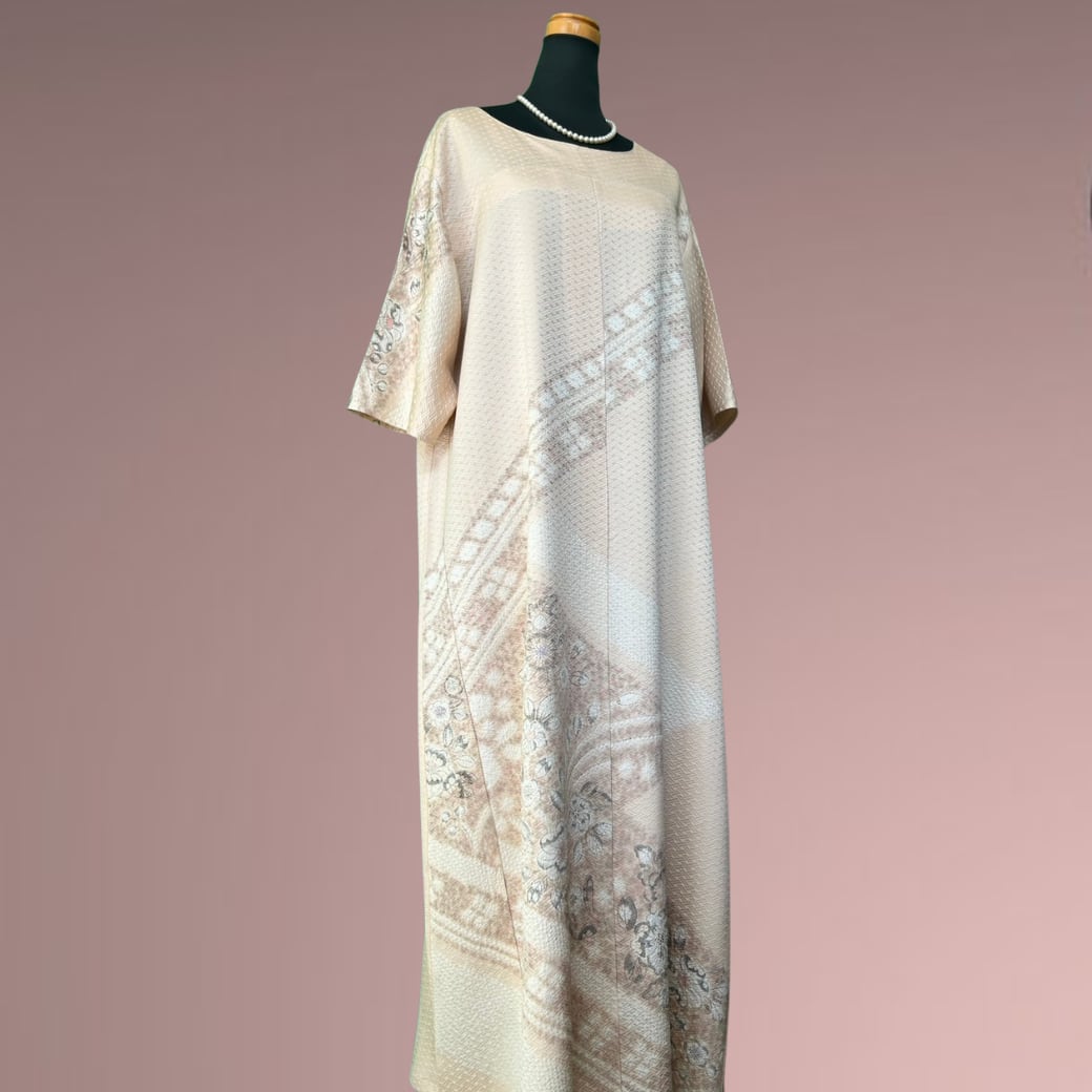 こちらの着物ワンピースは、淡く上品な色留袖をもとに仕立てた一着です。